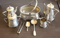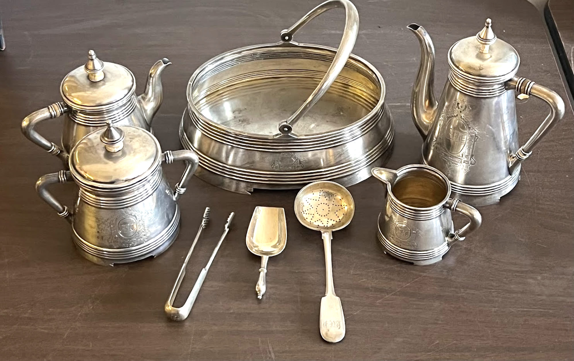 Other auction highlights include: Important pre-surrealist oil by Giorgio De Chirico (1888-1978) fresh from a famous American artist’s family collection, Russian Imperial tea service by Andrey Alexandrov (circa 1908), rare lithograph titled, “A view of Castine from Hospital Island,” by Fitz Henry Lane (1804-1865), 18k gold pocket watch belonging to D.H Rivers of Thomaston, Me., Captain of the ship A.G.Ropes. The watch was presented to him by the British Government for his kindness and humanity of the shipwrecked crew of the Barque Glanperis, off Cape Horn in 1892, a quarter plate ambrotype of Castine, Me. showing the landscape, houses, etc., map of Penobscot Bay dated 1776 by Joseph F.W. Des Barres, several Native American beaded items from a Maine collection including peace pipes, tobacco bags, vest, drum, early eye dazzler rug, pipe bag, sheath with eagle sword, and more. Lots of good sterling silver flatware and hollowware items, 150 American silver Morgan and Peace dollars, Province of Maine 1794 map by Samuel Lewis, wonderful selection of American period furniture from the Francis Bush estate including a fine inlaid secretary desk, Chippendale tall blanket chest, Boston Sheraton bow front chest, rosewood chest/cabinet by Stephen Smith, Boston cabinetmaker (circa 1830), Civil War items include a Sharps and Hankins .52 cal. Carbine, Manhattan Arms pepperbox pistol, several swords, belt, and more. A rare 1912 porcelain motorcycle license plate and a collected set of Maine from 1914-1949, fine mahogany brass inlaid captain’s travel desk, several oriental rugs, collectibles of all kinds.