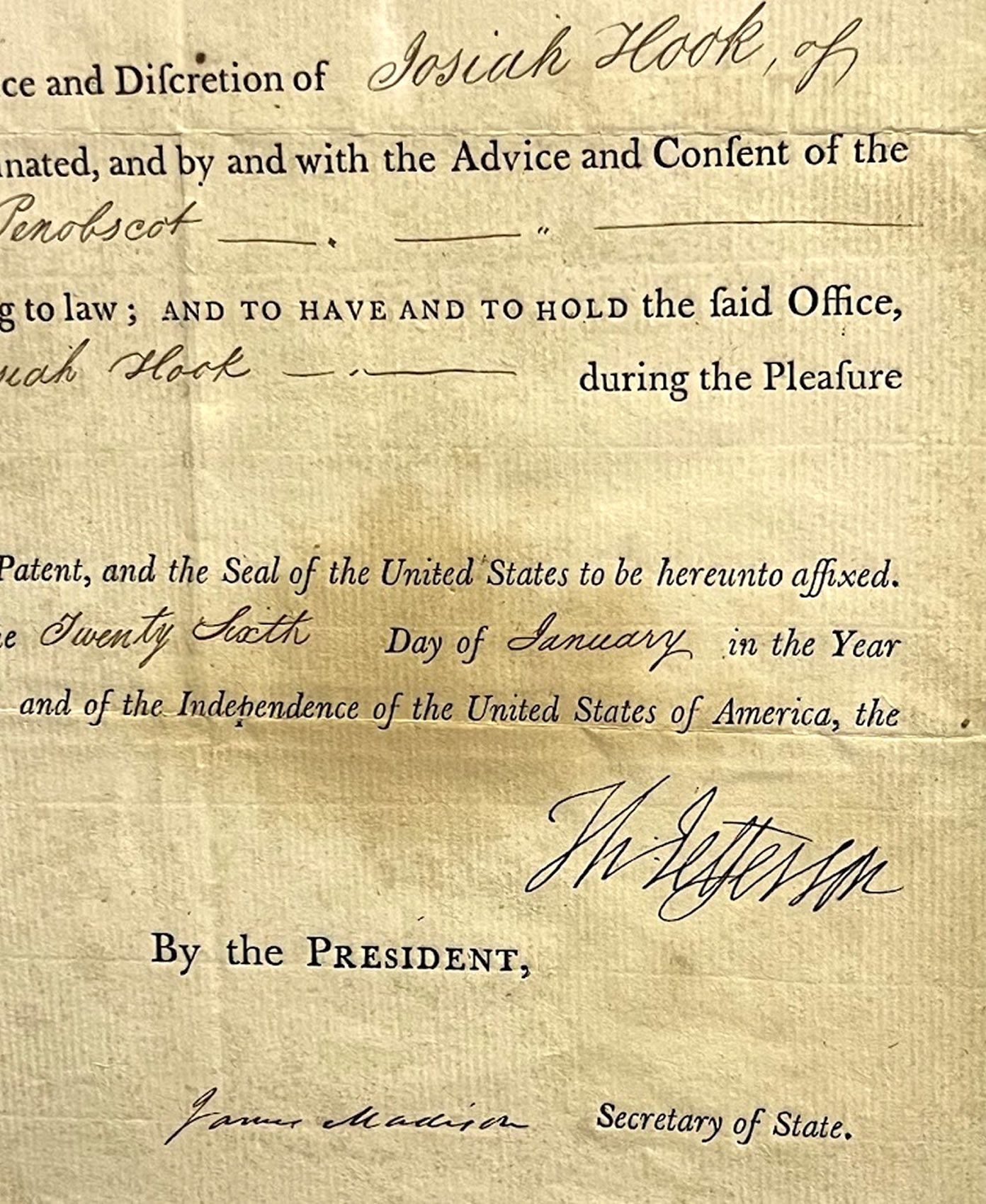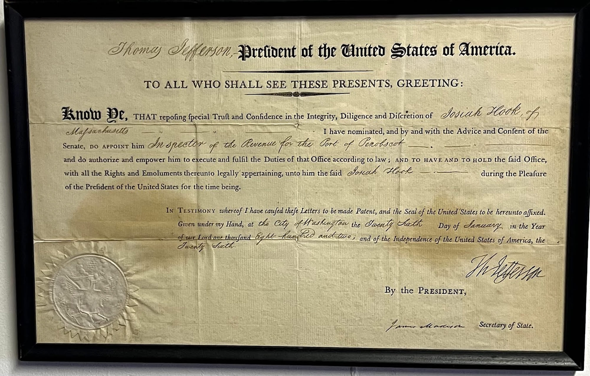 I am pleased to present our Annual Winter Estates Auction this year! Historic items from the Philip Booth estate of Castine, Me. and the Francis Bush estate from Camden and Brewer, Me. along with a plethora of fresh to the market estate items. The Booth estate housed several important American history items. Booth being a descendent of Josiah Hook (1774-1827) the Main St. Castine house was home to several Josiah Hook items including an important 18 th c. portrait of Hook attributed to John Brewster, Jr.(1766-1854). Also, Hook’s original 1802 appointment as Inspector of Revenue for the Port of Penobscot, signed by President Thomas Jefferson, a rare 18 th c. tall clock by Daniel Balch of Newburyport, Ma., and his North Shore tambour desk with eagle inlaid door, and more!