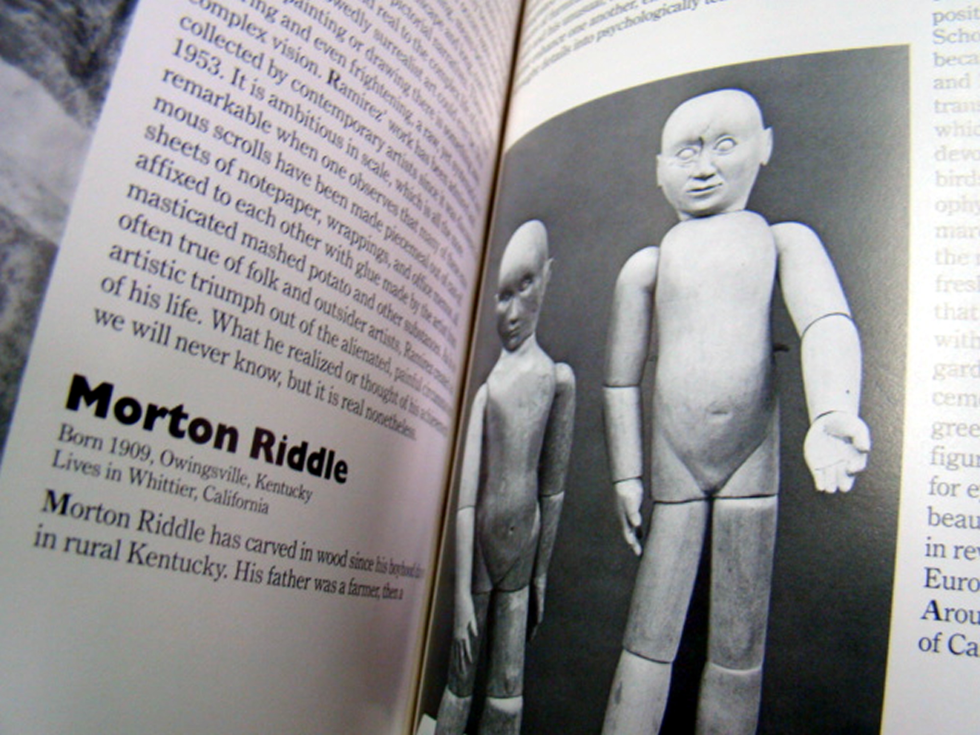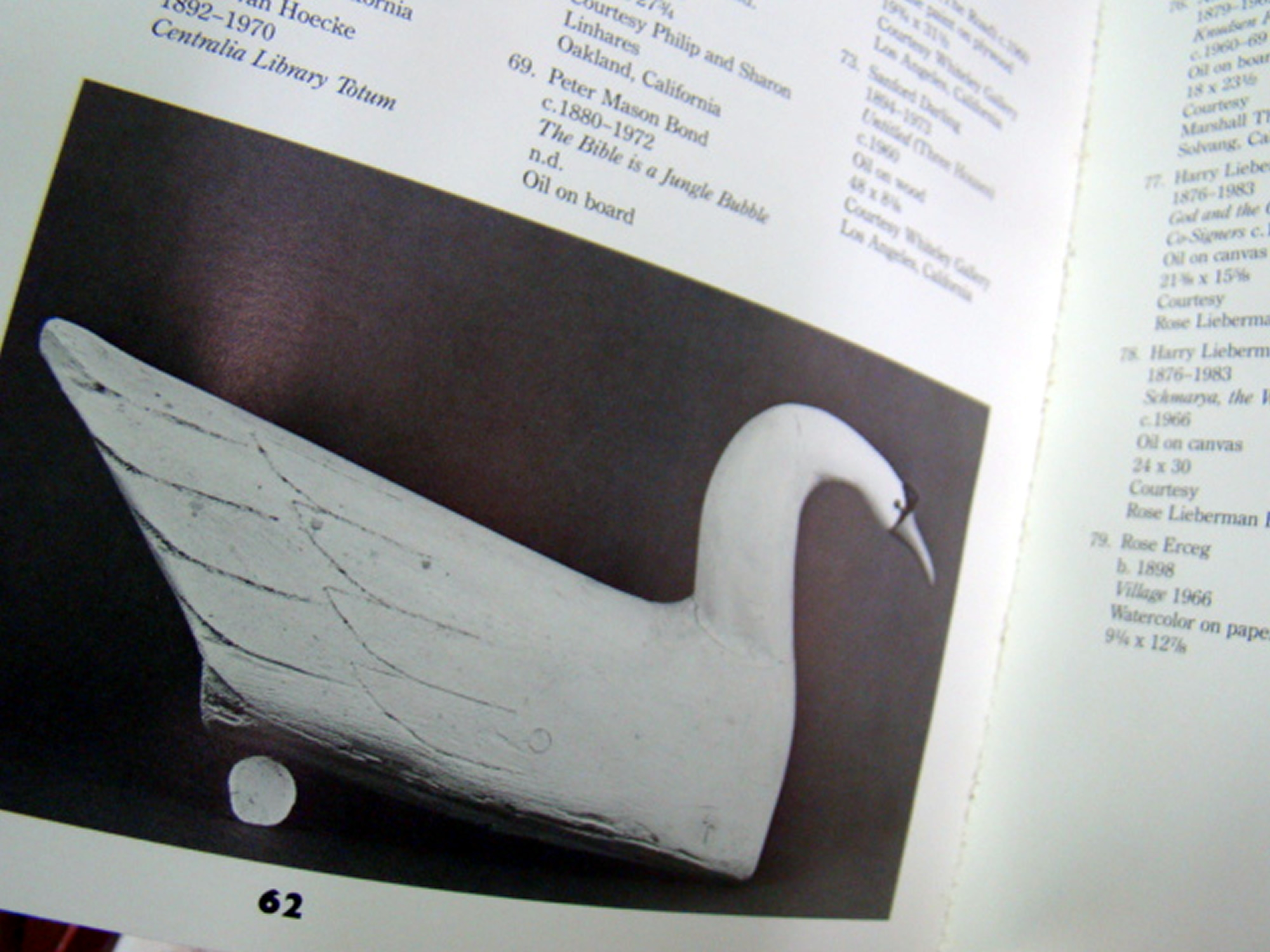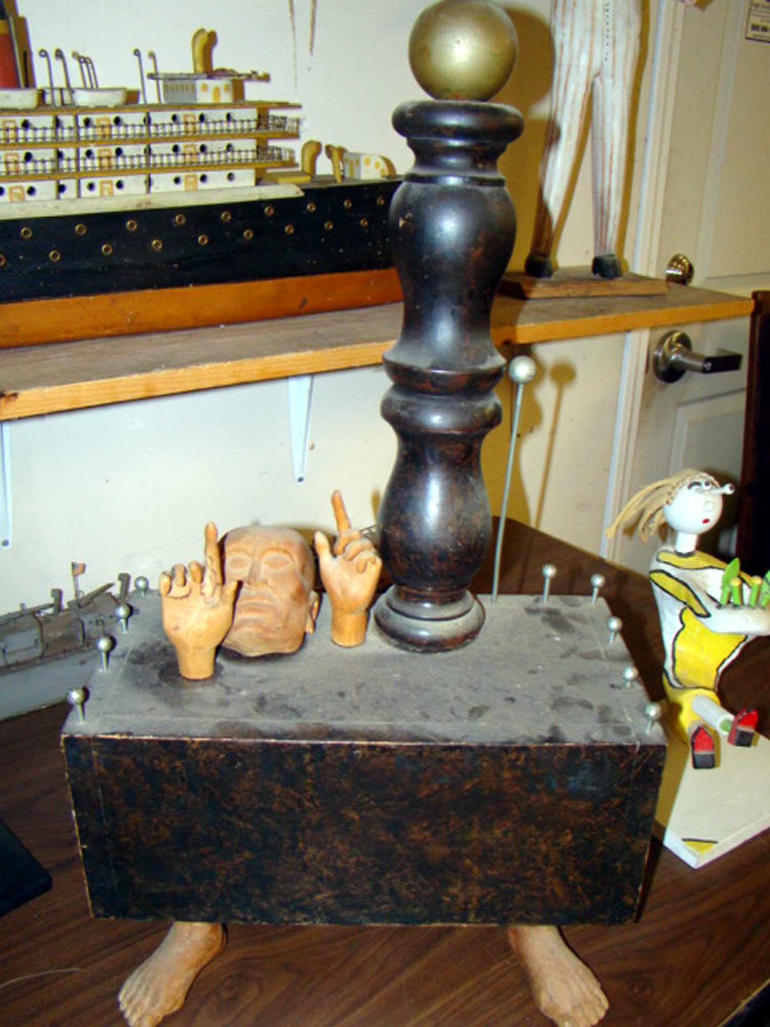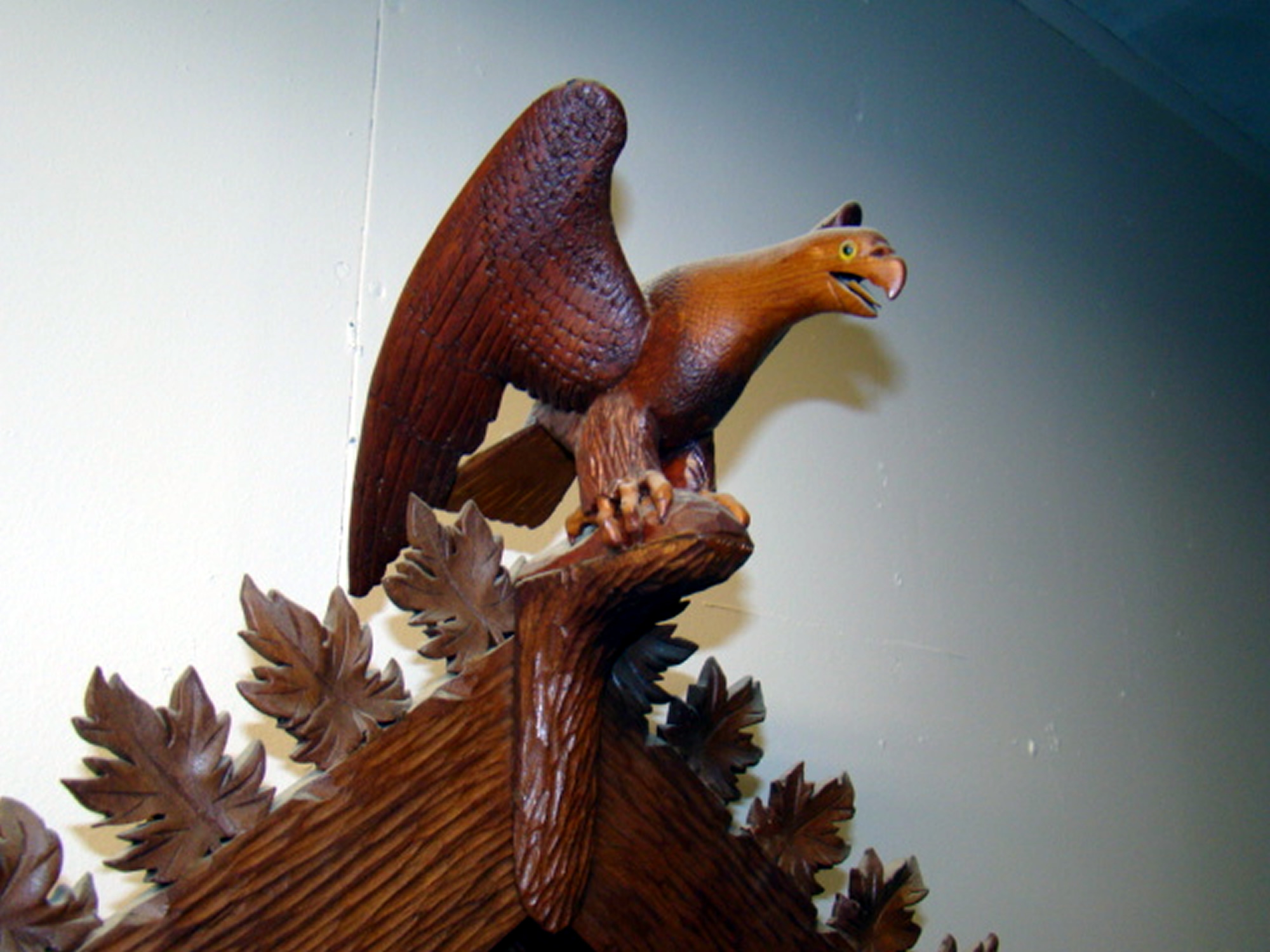 Spectacular hand carved cuckoo clock with eagles, etc. by Morton Riddle ; diorama by Howard Finster [1916-2001] , 4½" x 30", wood and painted glass; White Star Line wooden steam ocean liner Arabic ; folk art wooden man sculpture, 38" tall; wooden carved fully jointed doll by Morton Riddle featured in "Pioneers in Paradise Show 1984" ; early soldier whirligig ; two (2) prints by Christophe Leroux titled "Chazz Janne" and Chazz Rouge II, signed and numbered; folk art wooden "Uncle Sam" figure, 25" tall; 20th c. Superman whirligig; three (3) carved wooden fully jointed dolls by Morton Riddle ; large model of the Golden Gate Bridge , 72" long, used in the "Pioneers in Paradise Folk Art Show" in 1984; large white swan carved by David Rust [b.1908] , also displayed at the "Pioneers Show 1984, 36" long, 20" high; two (2) paintings on plywood by Mose Tolliver [1919-2006] , man with flowers and fawn; Morton Riddle doll in box carving; sculpture by Robert Gilkerson with eyes popping out; wooden bi-plane whirligig; plus more !!!