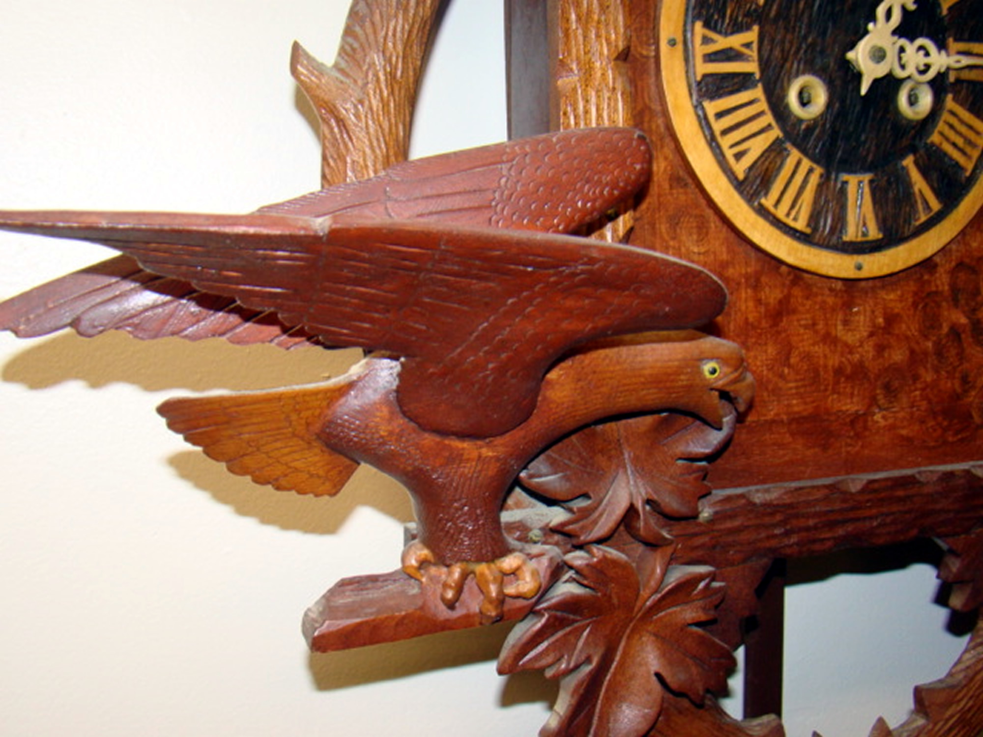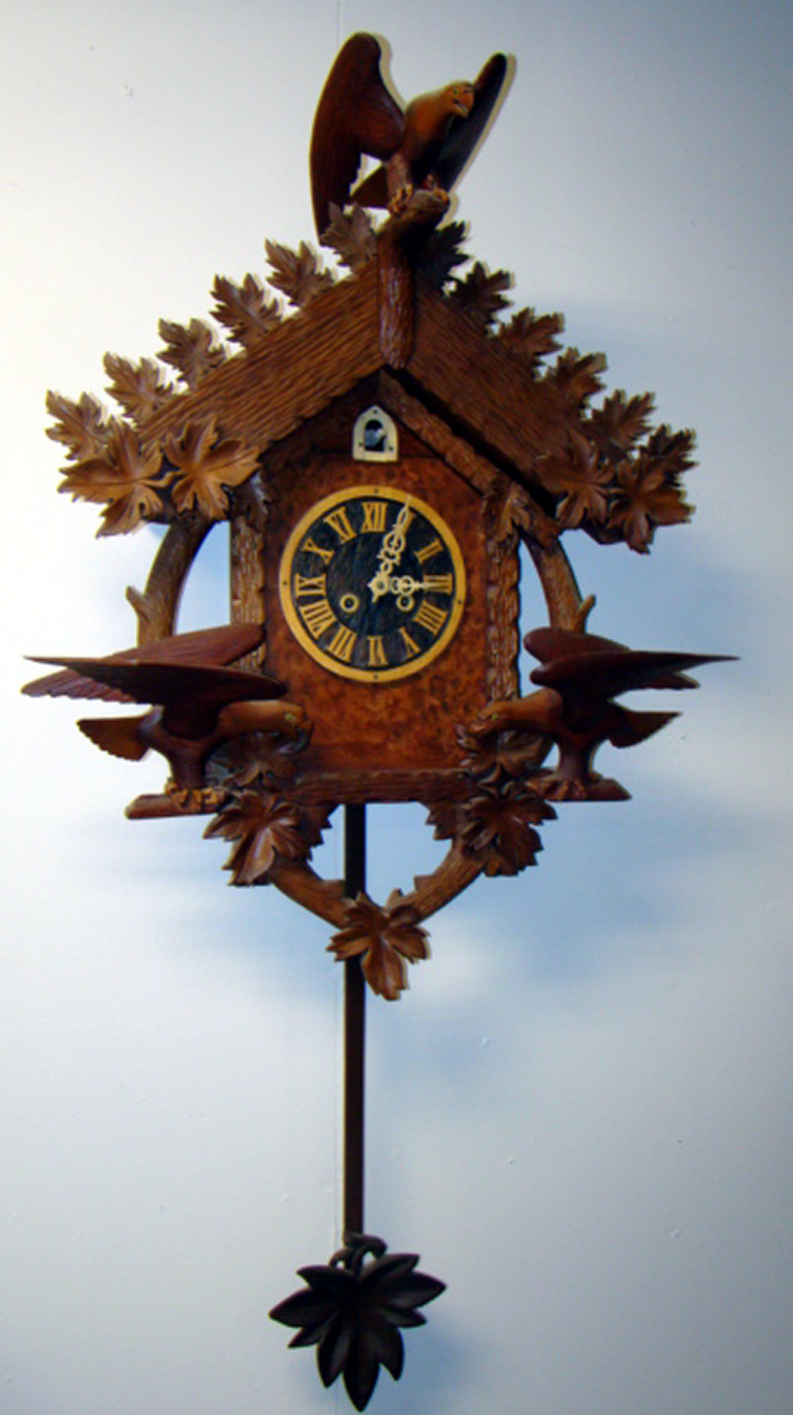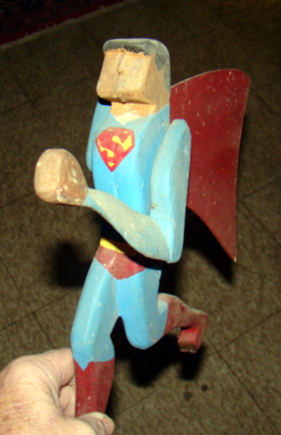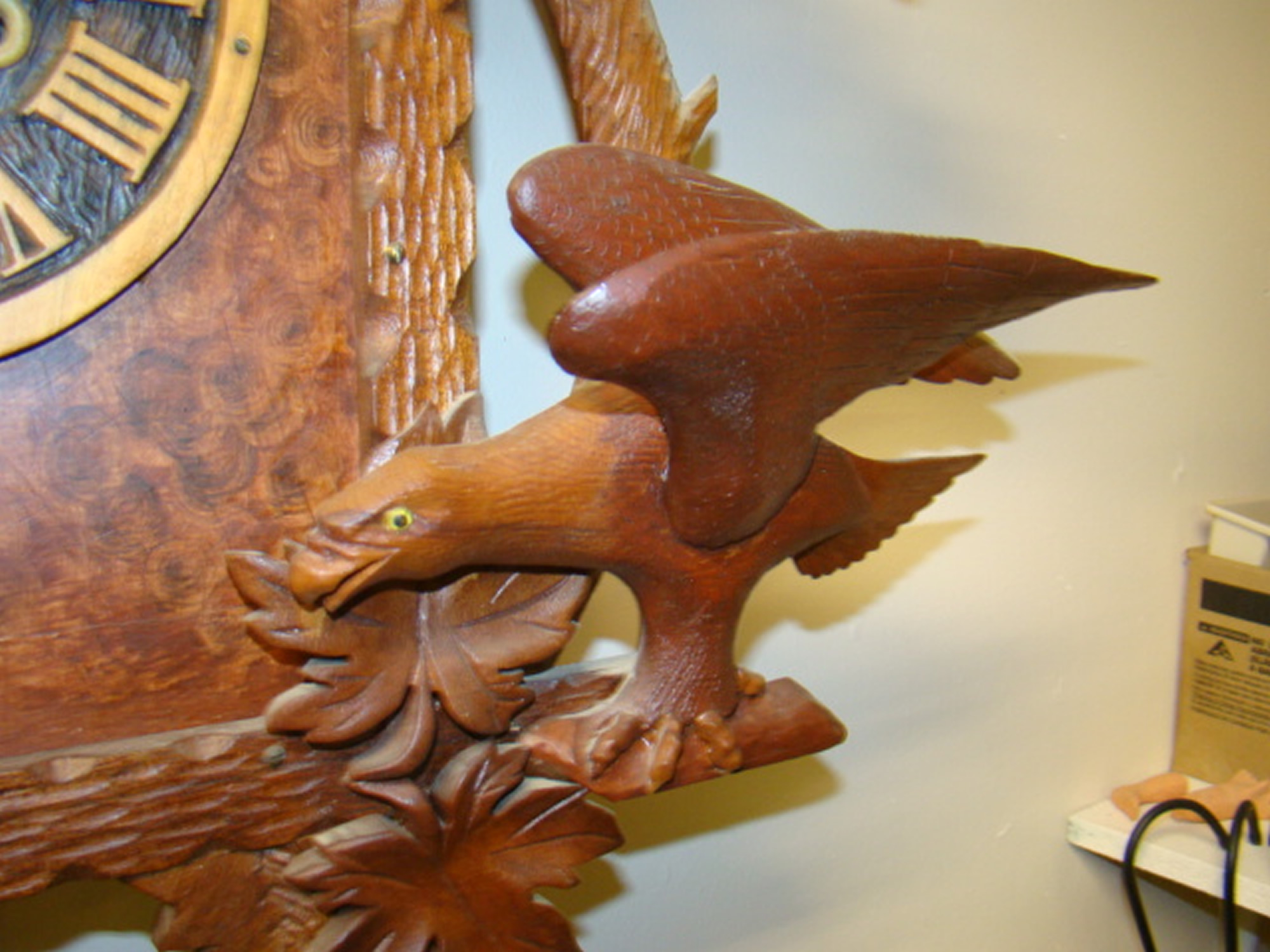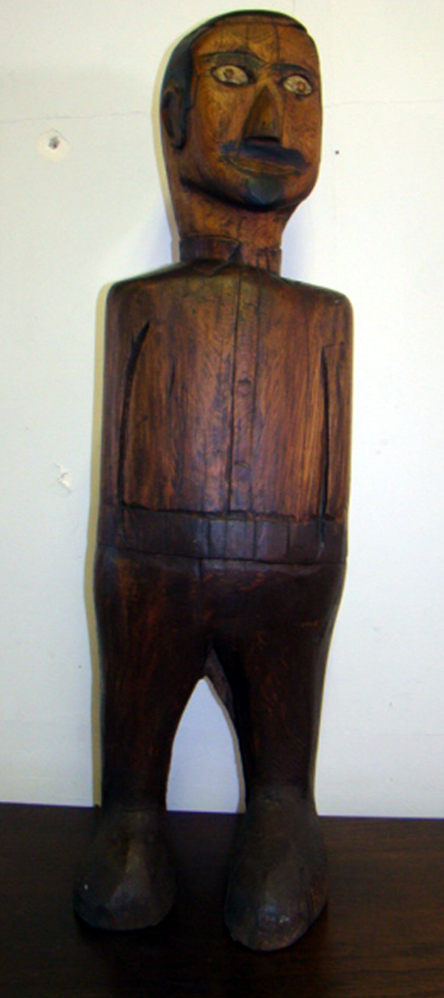 Spectacular hand carved cuckoo clock with eagles, etc. by Morton Riddle ; diorama by Howard Finster [1916-2001] , 4½" x 30", wood and painted glass; White Star Line wooden steam ocean liner Arabic ; folk art wooden man sculpture, 38" tall; wooden carved fully jointed doll by Morton Riddle featured in "Pioneers in Paradise Show 1984" ; early soldier whirligig ; two (2) prints by Christophe Leroux titled "Chazz Janne" and Chazz Rouge II, signed and numbered; folk art wooden "Uncle Sam" figure, 25" tall; 20th c. Superman whirligig; three (3) carved wooden fully jointed dolls by Morton Riddle ; large model of the Golden Gate Bridge , 72" long, used in the "Pioneers in Paradise Folk Art Show" in 1984; large white swan carved by David Rust [b.1908] , also displayed at the "Pioneers Show 1984, 36" long, 20" high; two (2) paintings on plywood by Mose Tolliver [1919-2006] , man with flowers and fawn; Morton Riddle doll in box carving; sculpture by Robert Gilkerson with eyes popping out; wooden bi-plane whirligig; plus more !!!