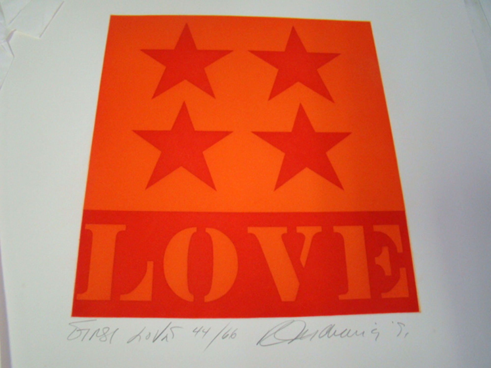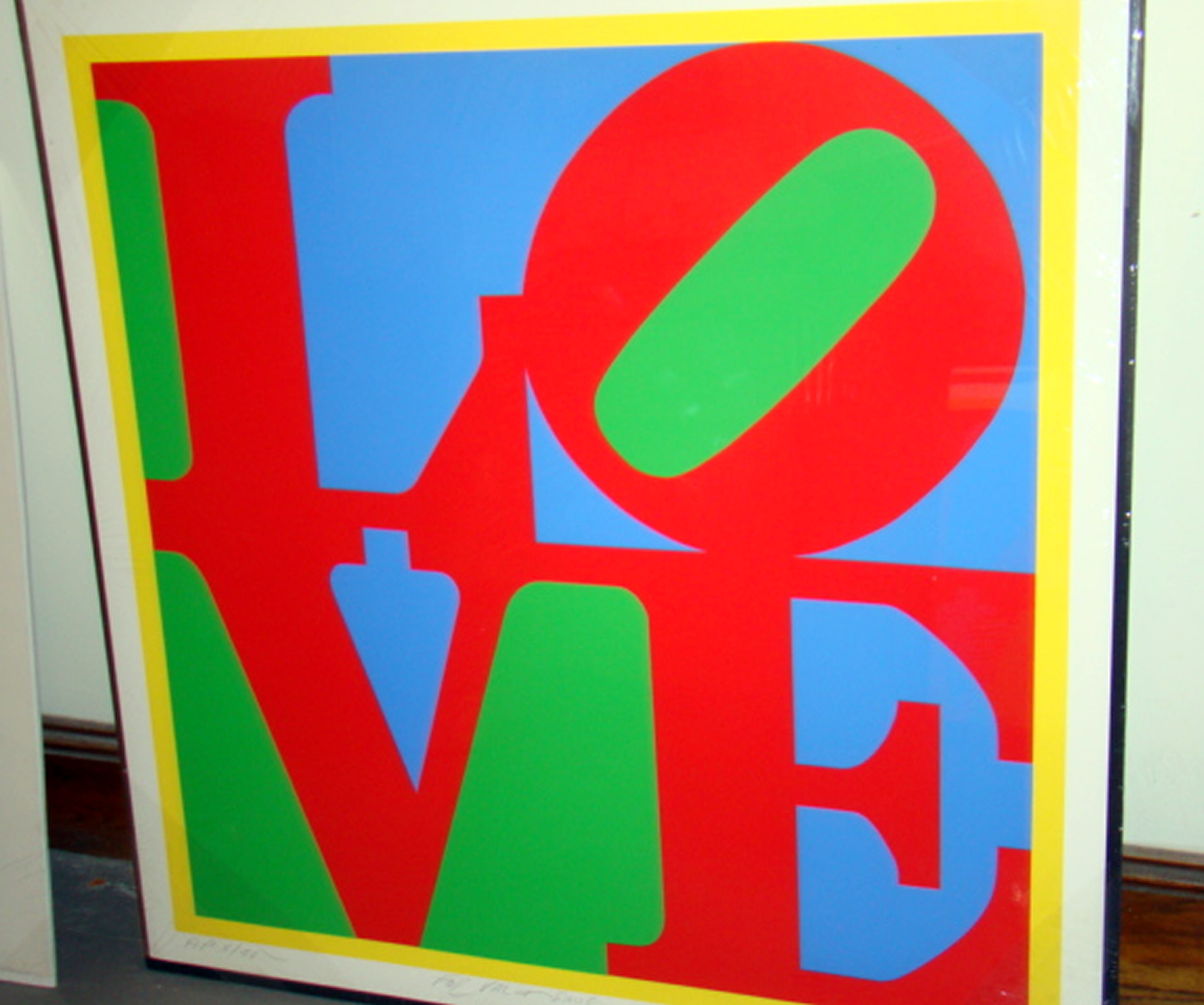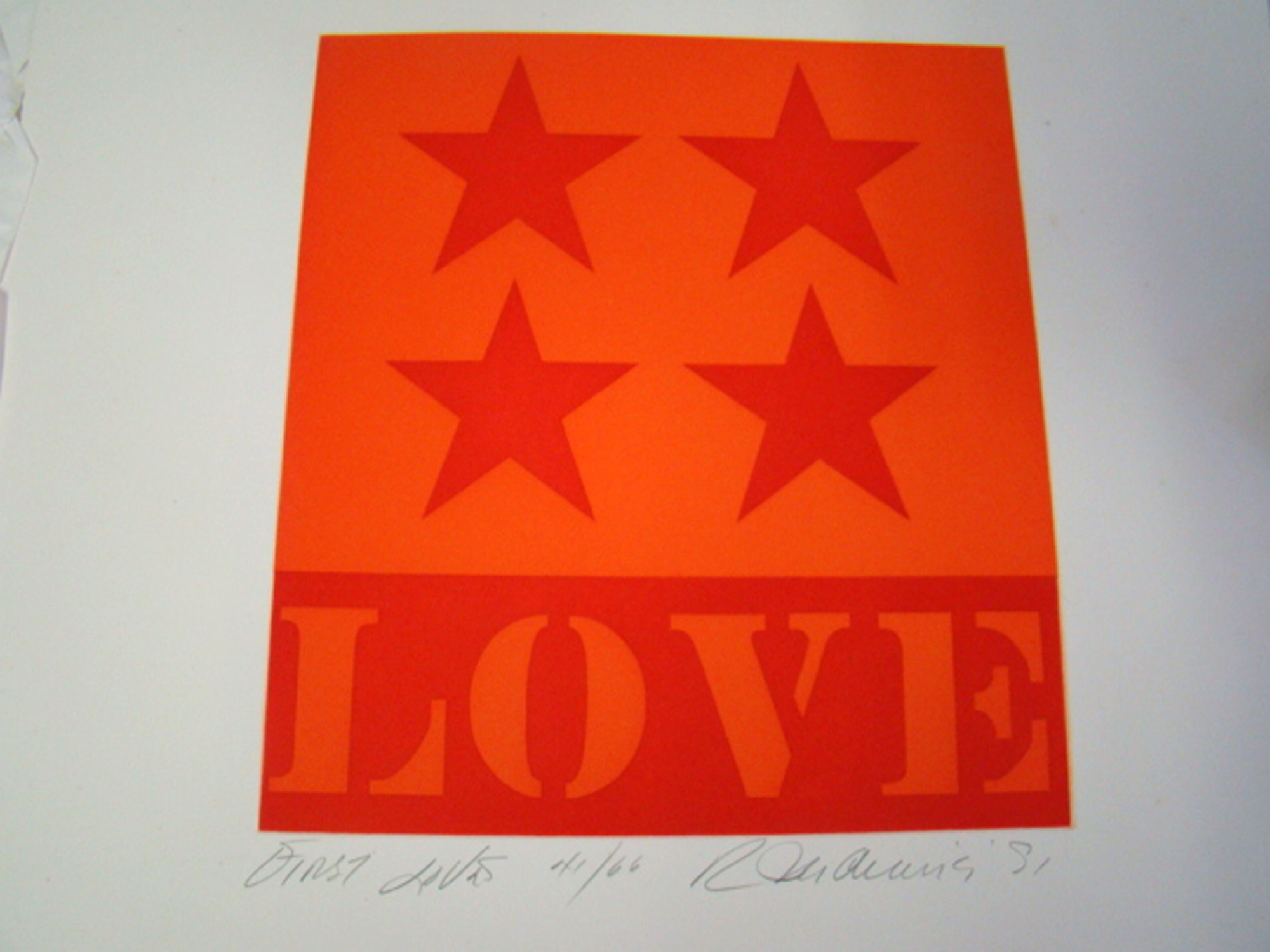 "First Love" 1991, paper size 20" x 27", image size 11" x 12", signed #41/66; aquatint etching "First Love" 1991, paper size 20" x 27", image size 11" x 12" , signed #44/66; silkscreen on paper AMOR , paper 30" x 31", image size 24" x 24", signed v/x "94"; silkscreen on paper "AHAVA" (Hebrew for love), paper size 31" x 33", image size 25" x 25", signed 7/25 "93"; silkscreen on paper "Parrot" , 33" x 40", signed Artist Proof; two (2) lots of signed Robert Indiana books; pencil drawing of "Frank" by Robert Indiana, 20" x 26", framed by Doug Rosen.