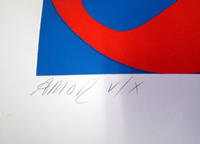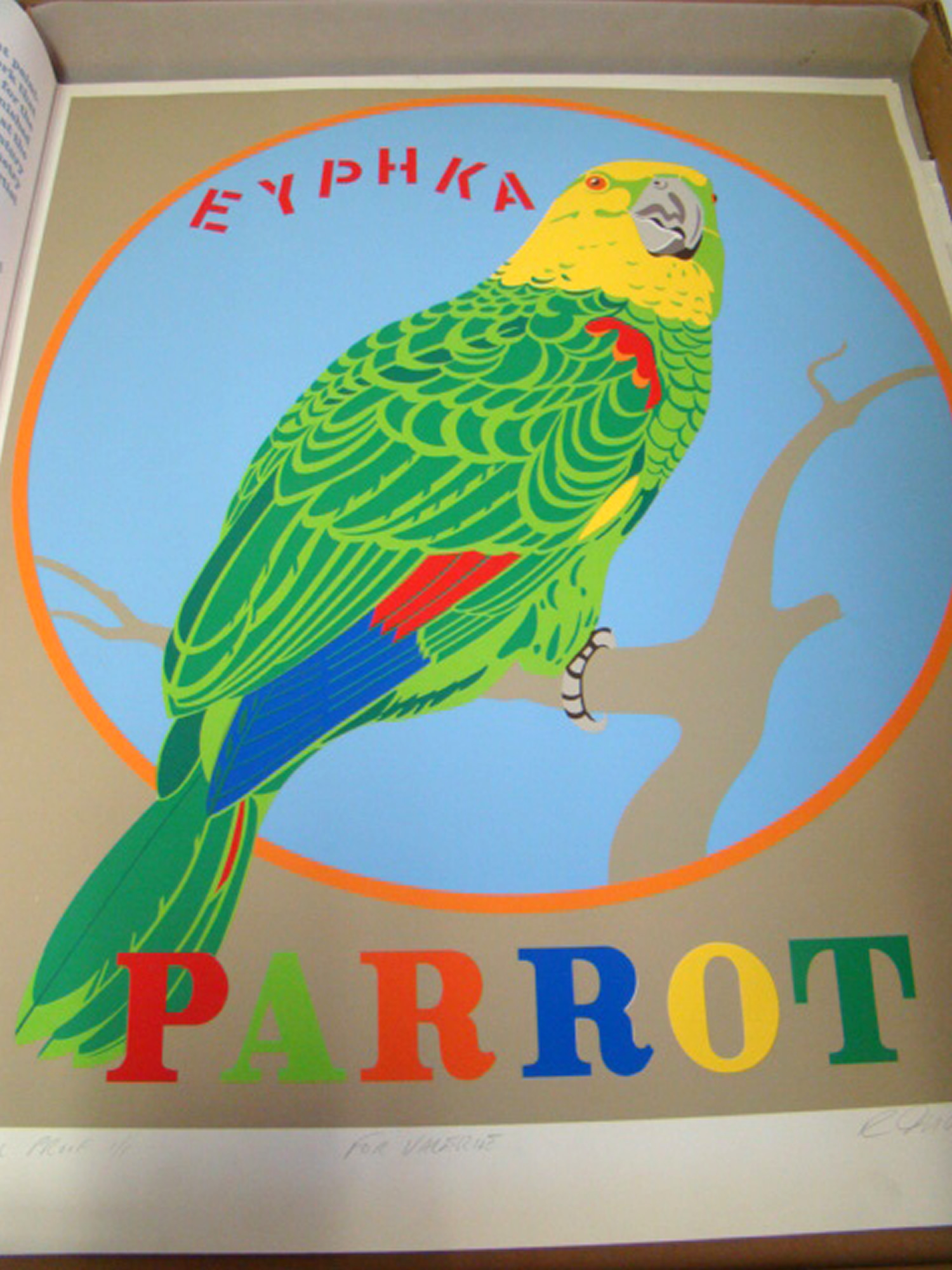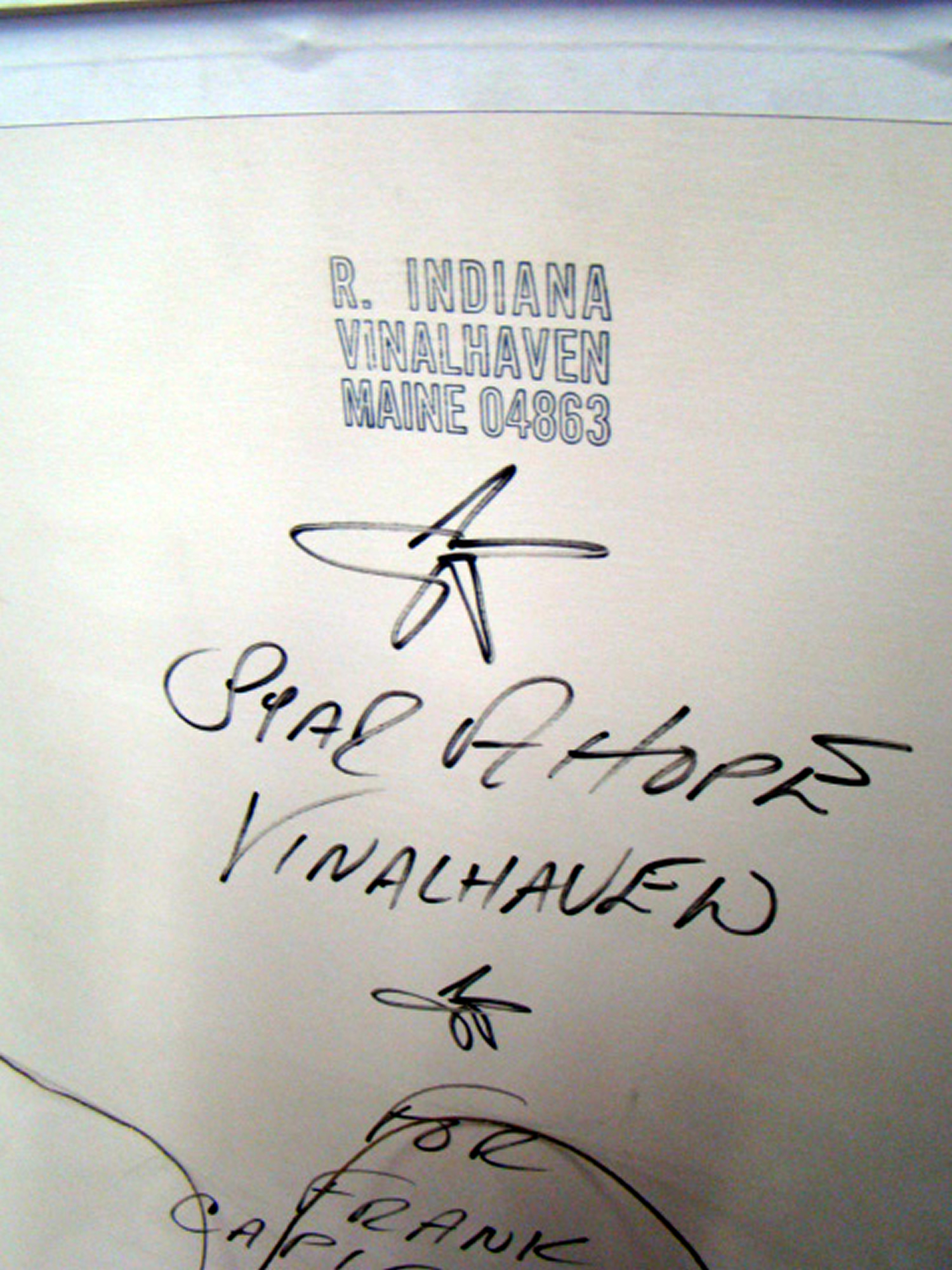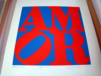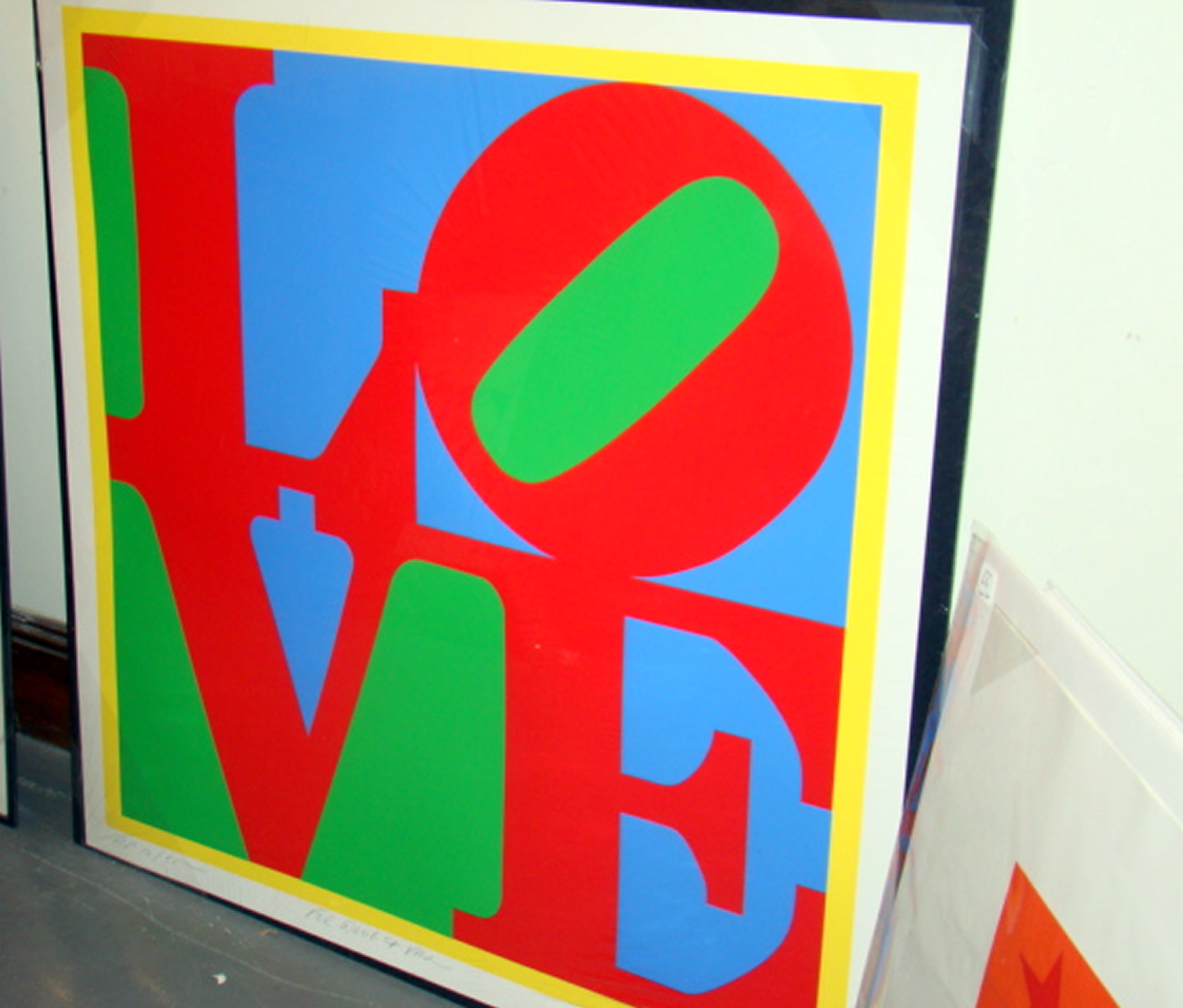 "First Love" 1991, paper size 20" x 27", image size 11" x 12", signed #41/66; aquatint etching "First Love" 1991, paper size 20" x 27", image size 11" x 12" , signed #44/66; silkscreen on paper AMOR , paper 30" x 31", image size 24" x 24", signed v/x "94"; silkscreen on paper "AHAVA" (Hebrew for love), paper size 31" x 33", image size 25" x 25", signed 7/25 "93"; silkscreen on paper "Parrot" , 33" x 40", signed Artist Proof; two (2) lots of signed Robert Indiana books; pencil drawing of "Frank" by Robert Indiana, 20" x 26", framed by Doug Rosen.