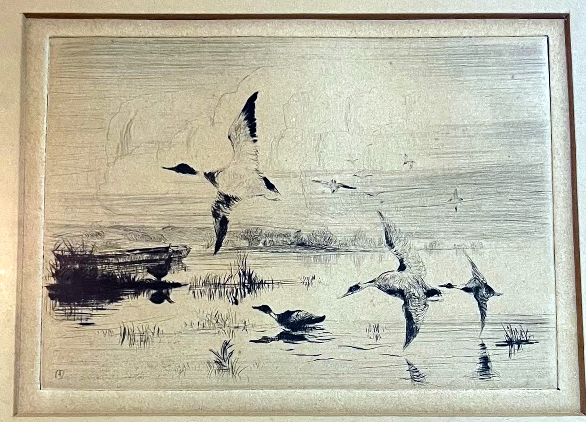 Etching of ducks in the marsh |