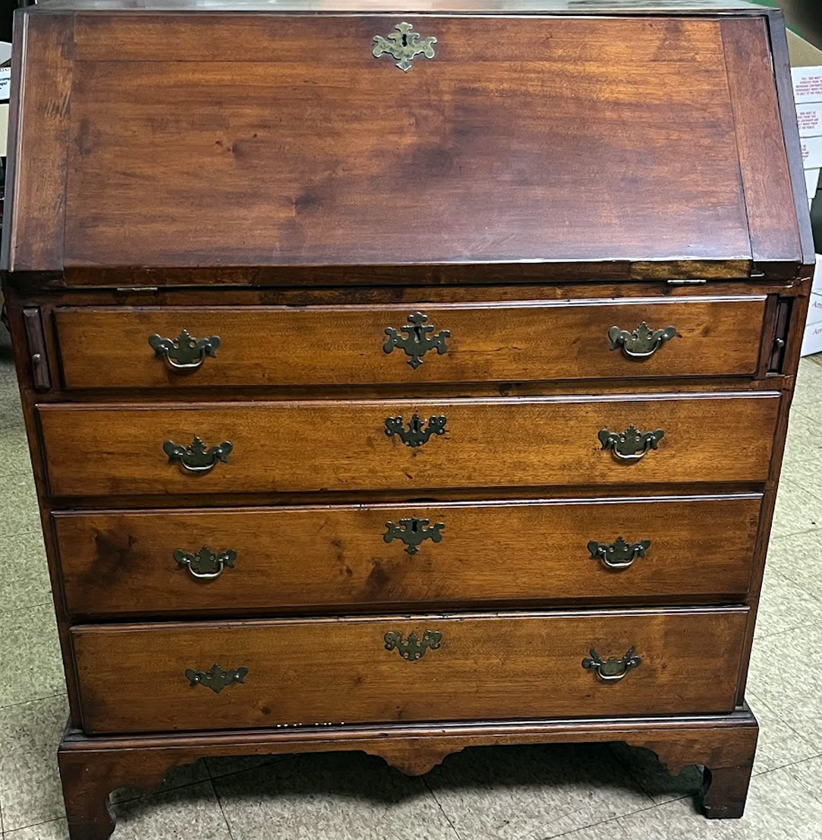 18th c Governor Winthop slant front desk, old refinish, 37in. w.