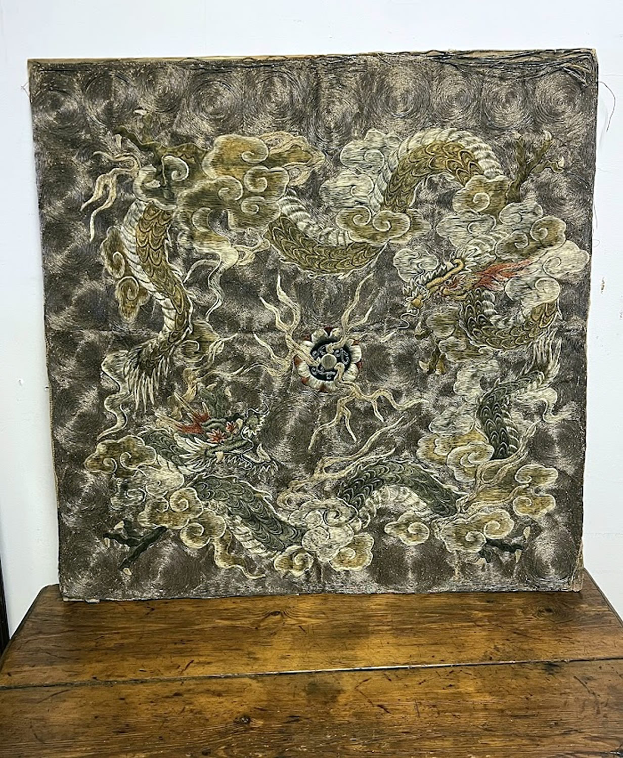 | Fine Chinese silk embrodery, gold and silver thread, 19th c., 34in.x34in. |