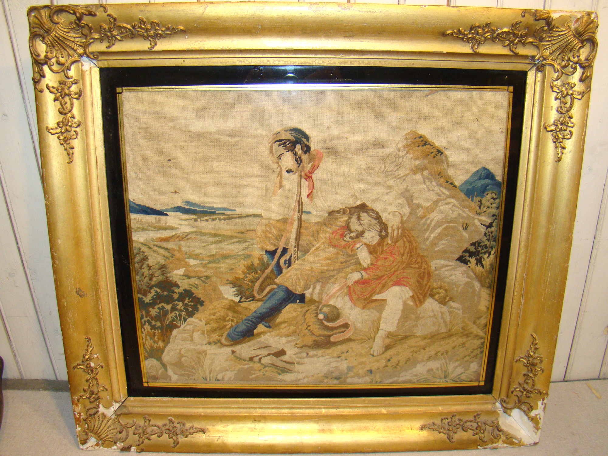 streetcar; 19 th c. needlepoint, framed, shepherd and child;