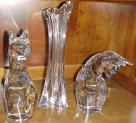 of Waterford table lamps, Daum Nance 14" vase and 2 cat figures,