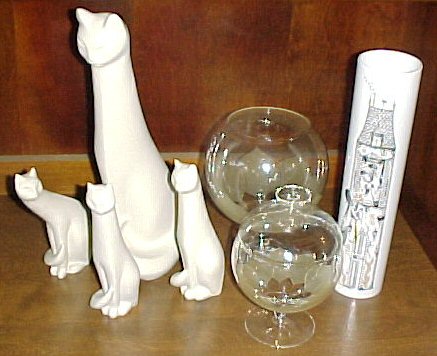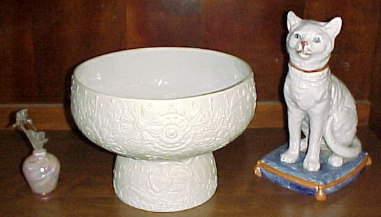 candelabra, 2 large cat figures, songbird compote, fish dish,