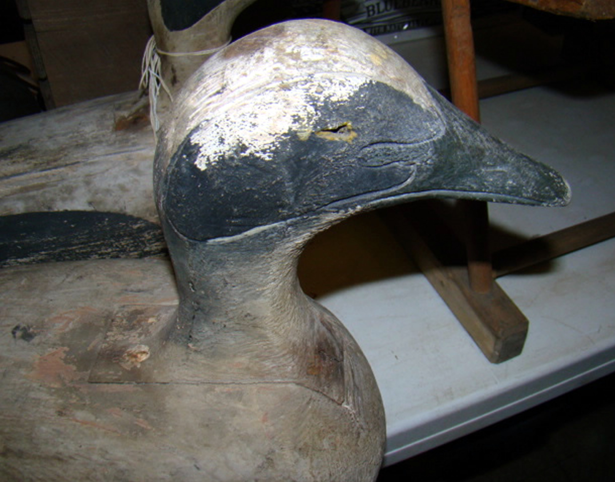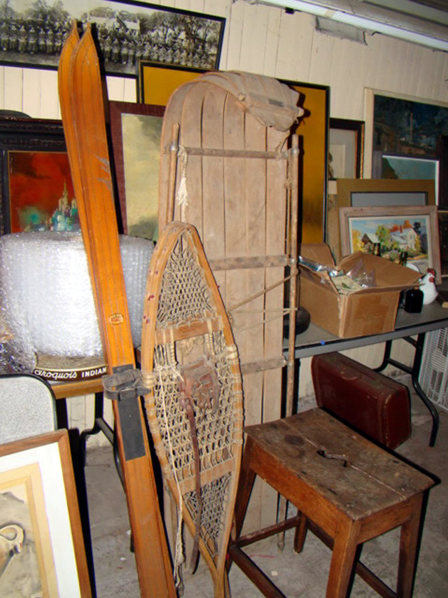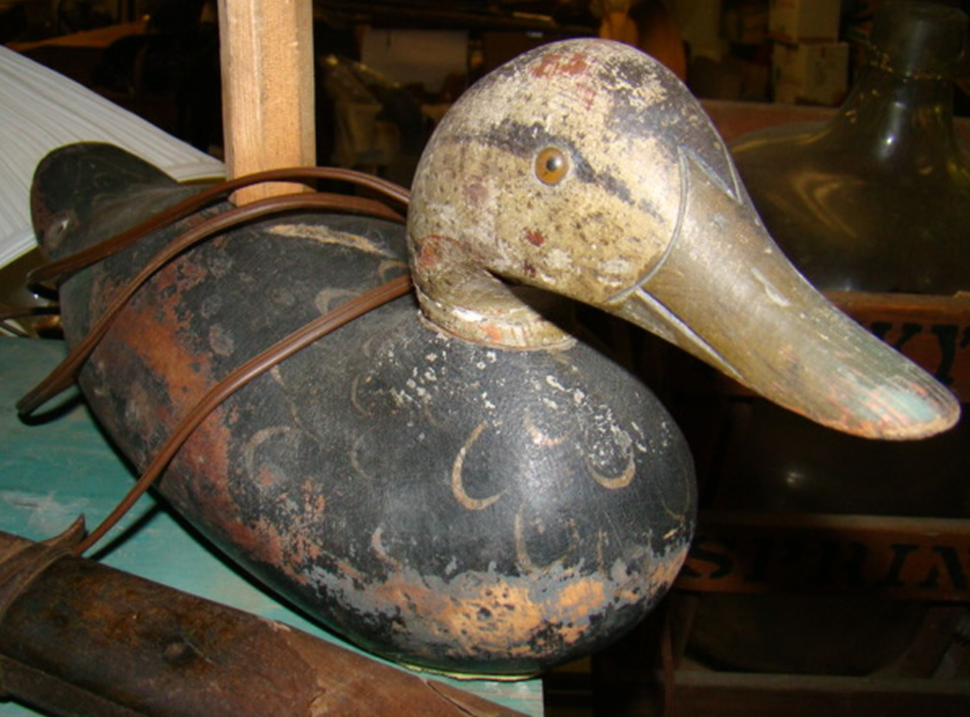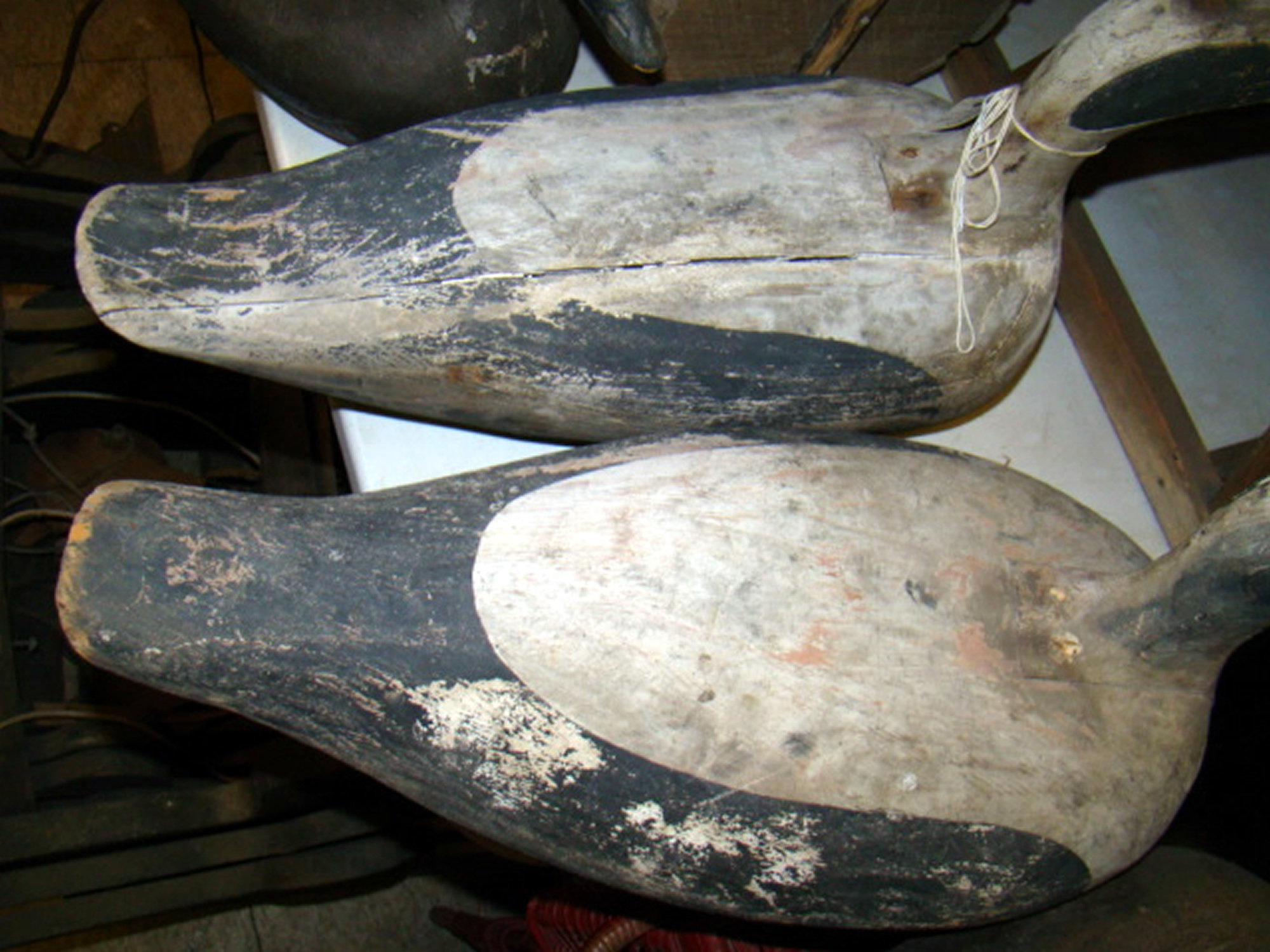 An outstanding pair of decoys fresh from a Rockland estate along with six working decoys with carved eyes plus a pair of Maine eider decoys from Vinalhaven, Maine. Also, two decoy lamps and driftwood decoys; South Paris toboggan; snowshoes; skis and old hunting boots with coat, etc.