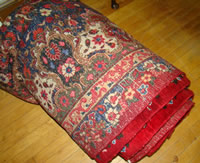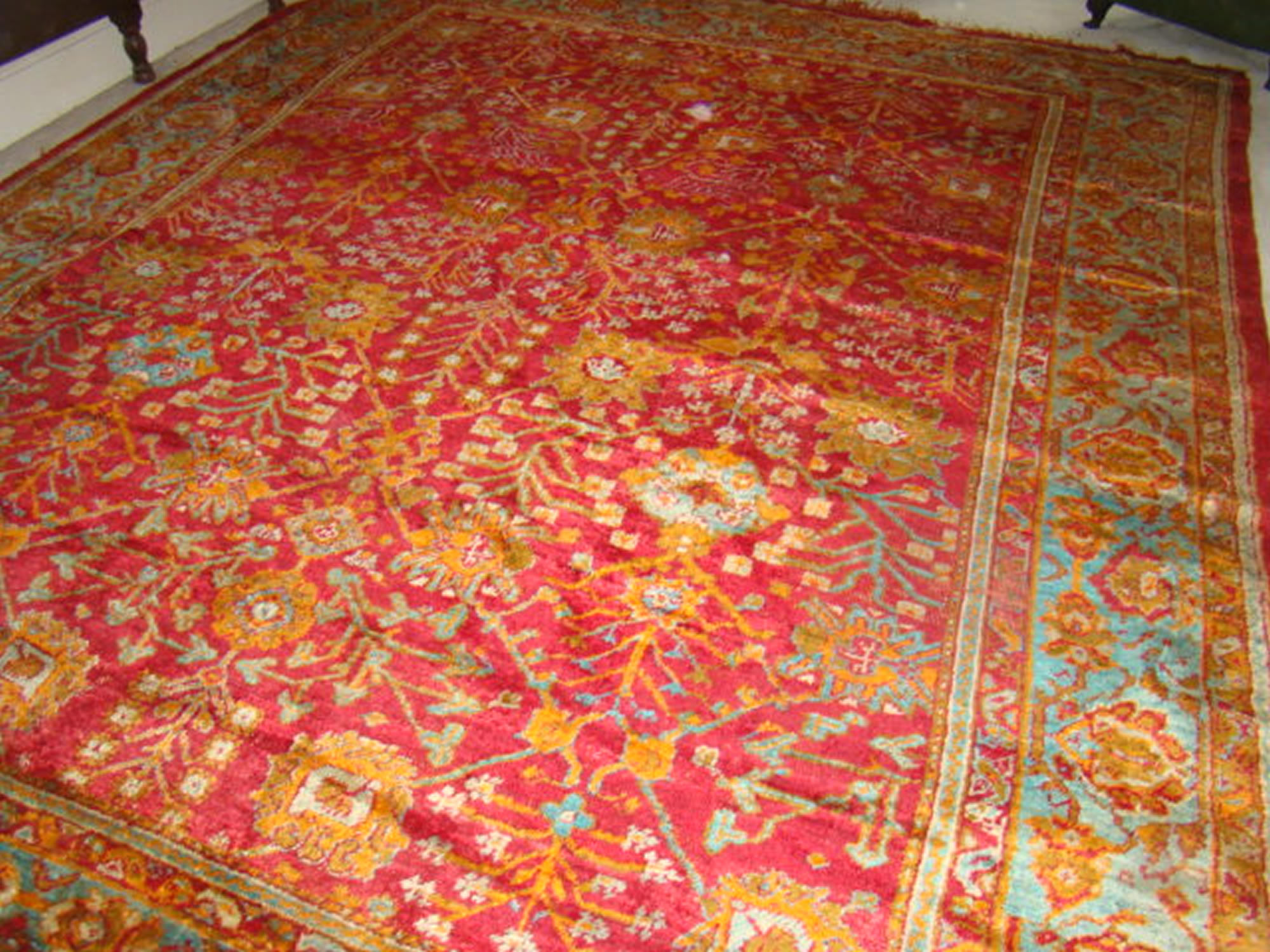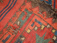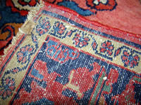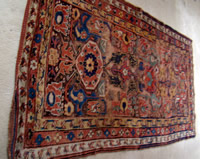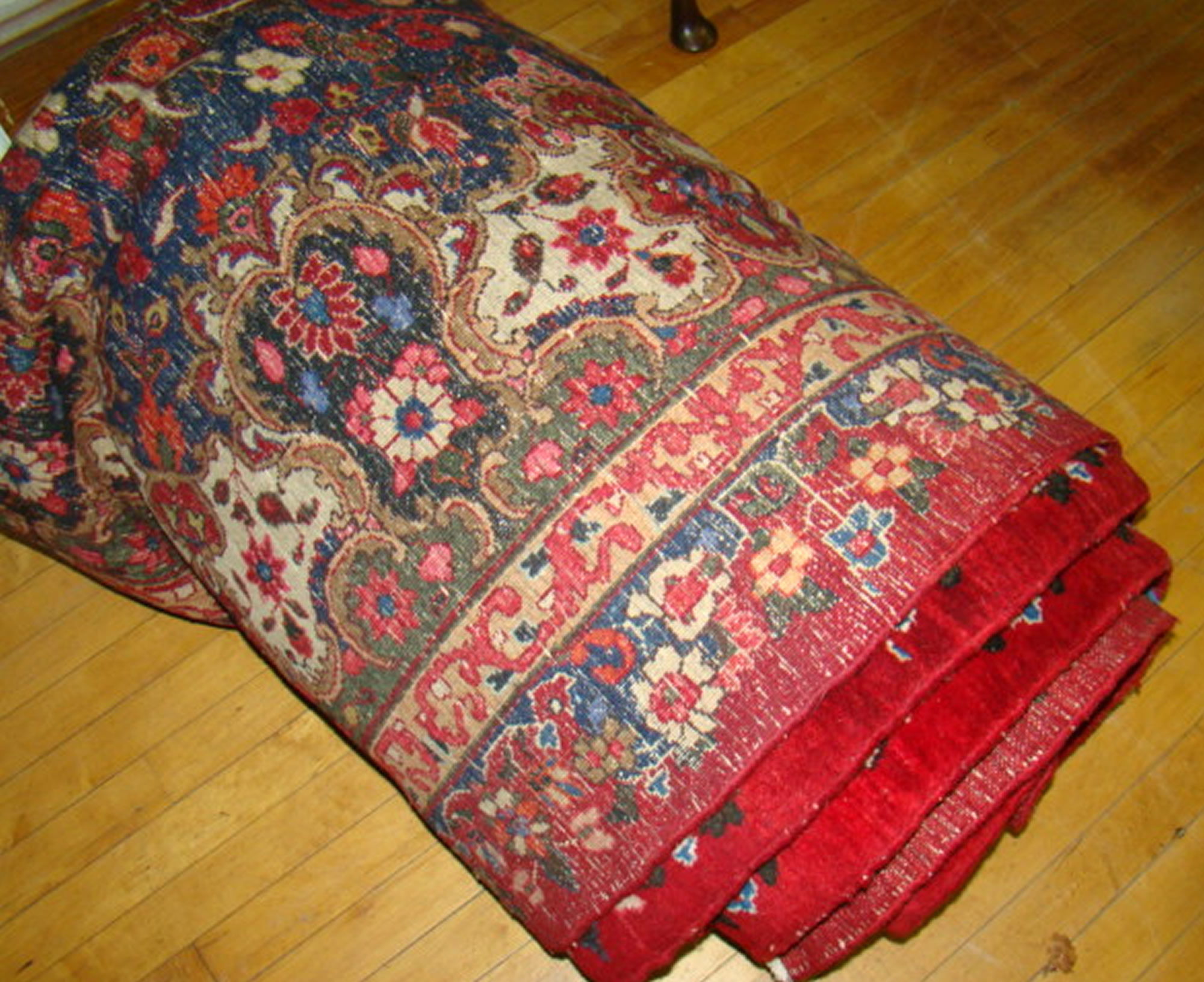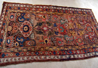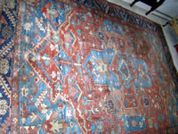 We offer this fresh selection of estate rugs from a Camden, Maine estate and more!!! Room-size Turkish Oushak rug, 10'2" x 13'2" with vivid colors; Persian Heriz carpet, 9'4" x 12'8" with wear; Kazak, 4'7" x 8' with brown color loss but very graphic, yellow, ivory borders; Persian Lilihan, 5'2" x 6'2", soft color in good condition; Ersari rug, 5'10" x 8'2" with wear; small 19th c. mat, 14" x 21"; early Caucasian rug with tear, probably Kazak, has yellow, blue, ivory borders, 5'2" x 8'4"; worn Caucasian rug with cobalt blue field, 4'4" x 7'2"; early Balvchi mat with Tree of Life design, 22" x 33"; wonderful room size Tabriz carpet with burgundy field, 9' x 12'; plus a few more!
