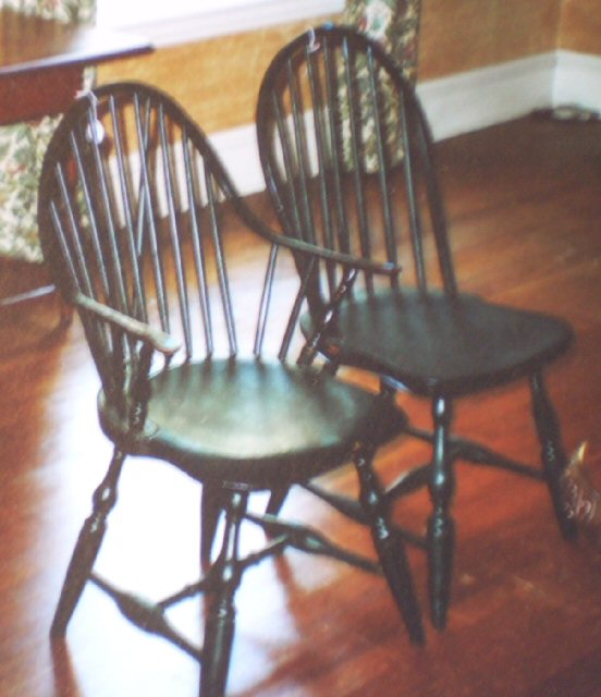 Windsor chairs; 7-foot custom-made sawbuck table; pine step-back