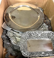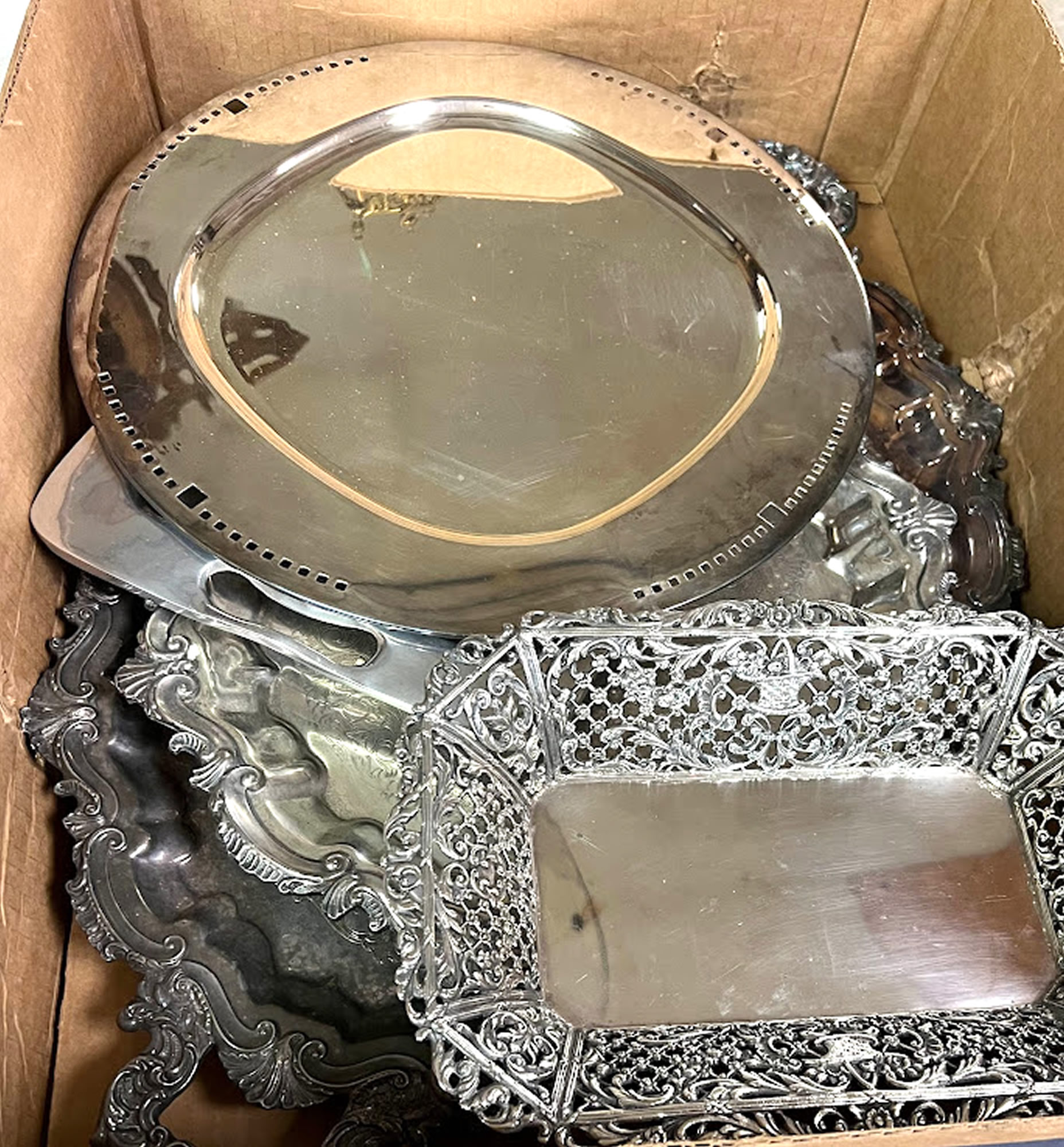Box lot of silver plated serving trays |