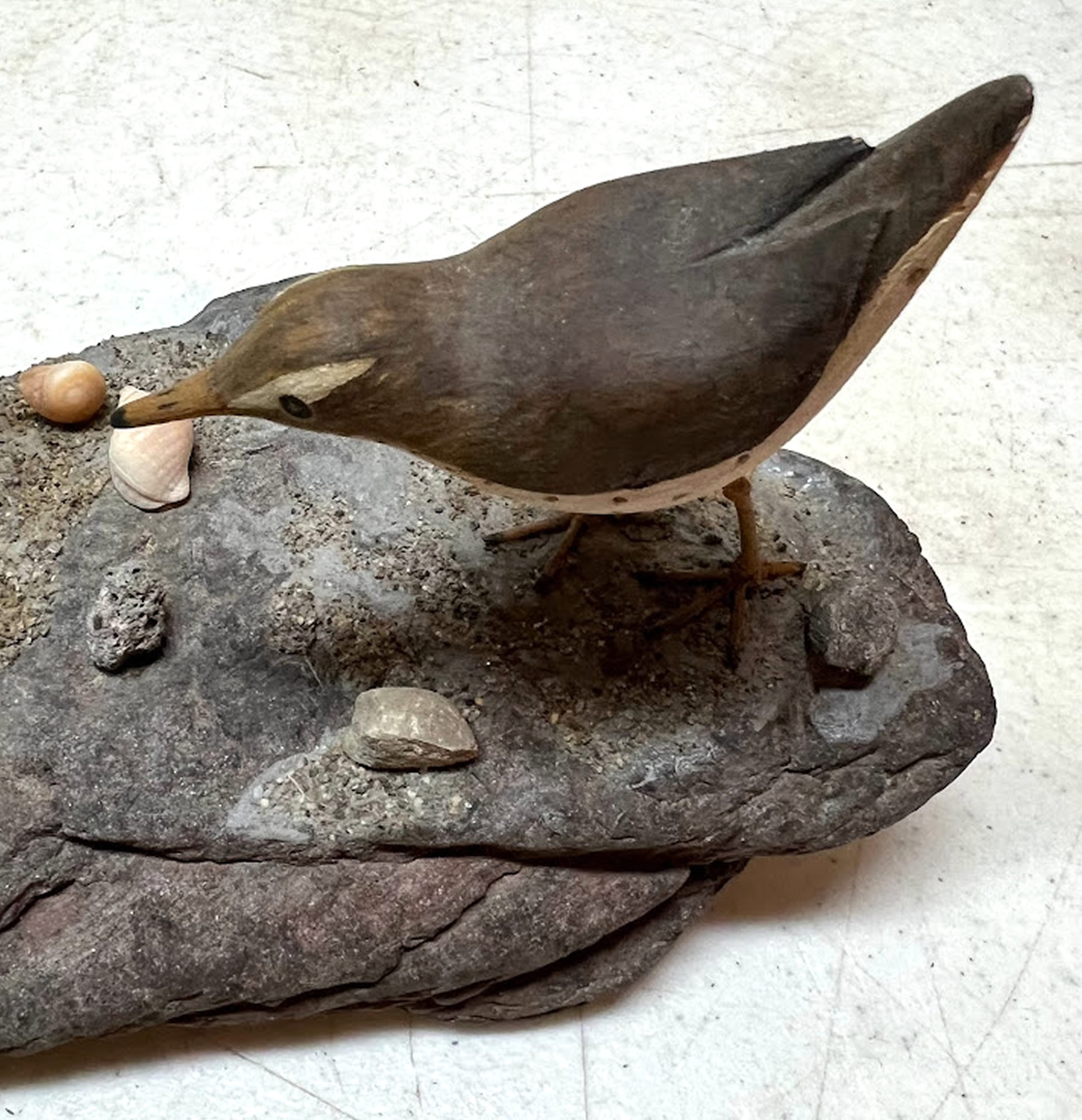 Miniature carved shorebirds mounted on slate |