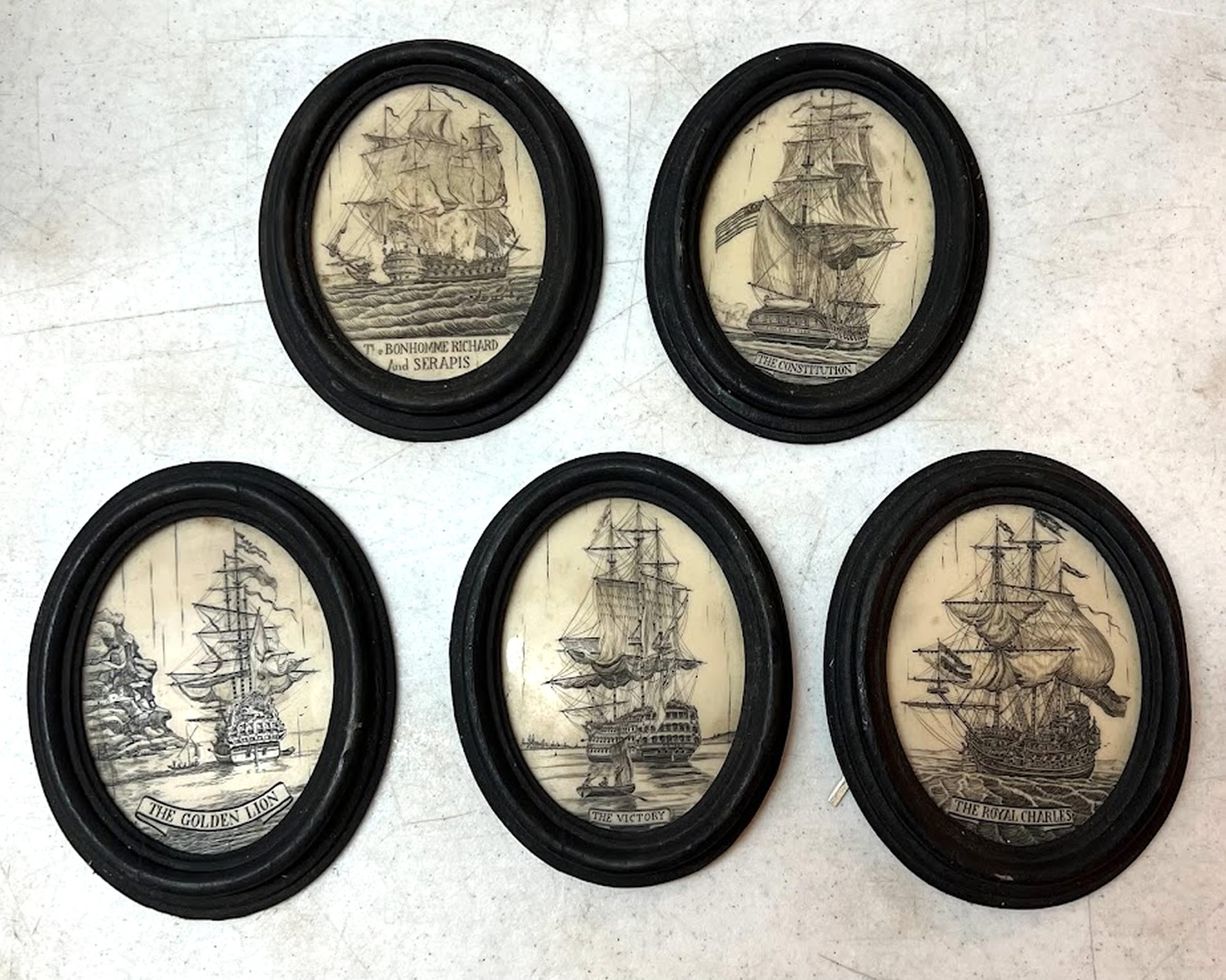 Set of (5) scrimshaw resin frames of famous ships, 4x6in. |