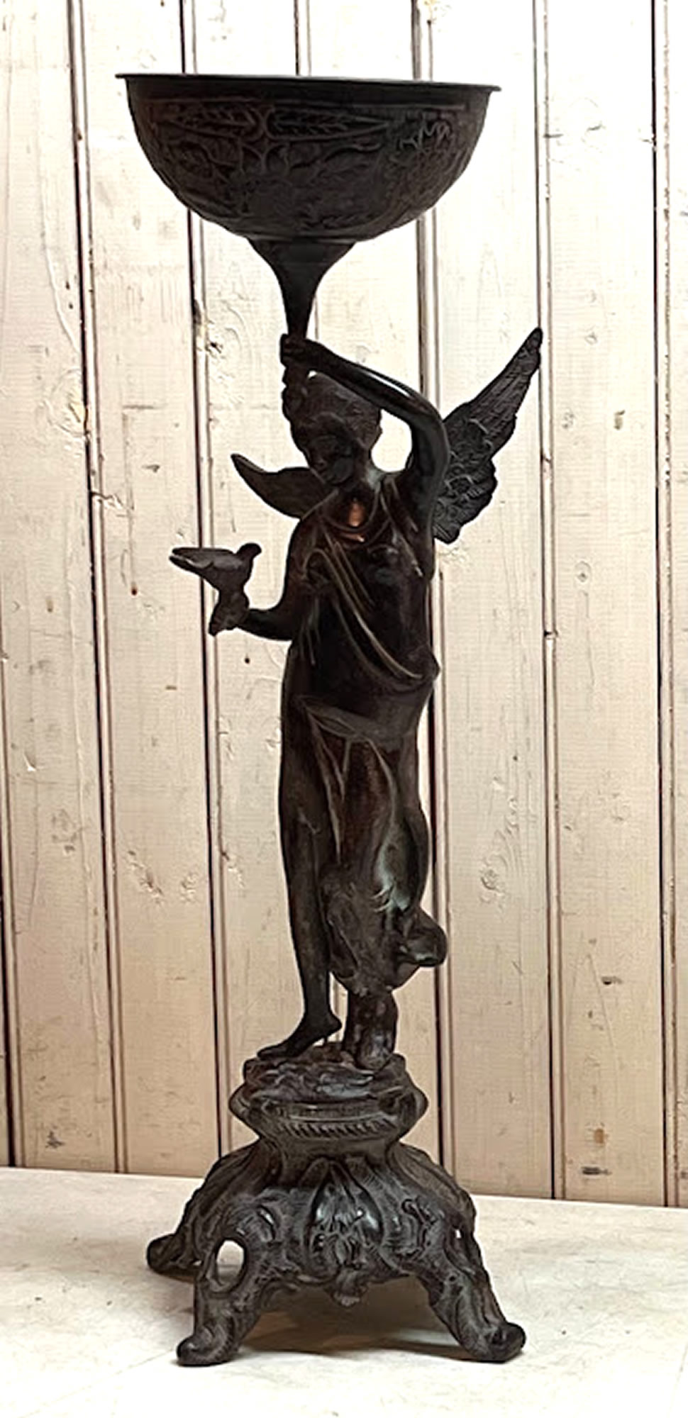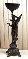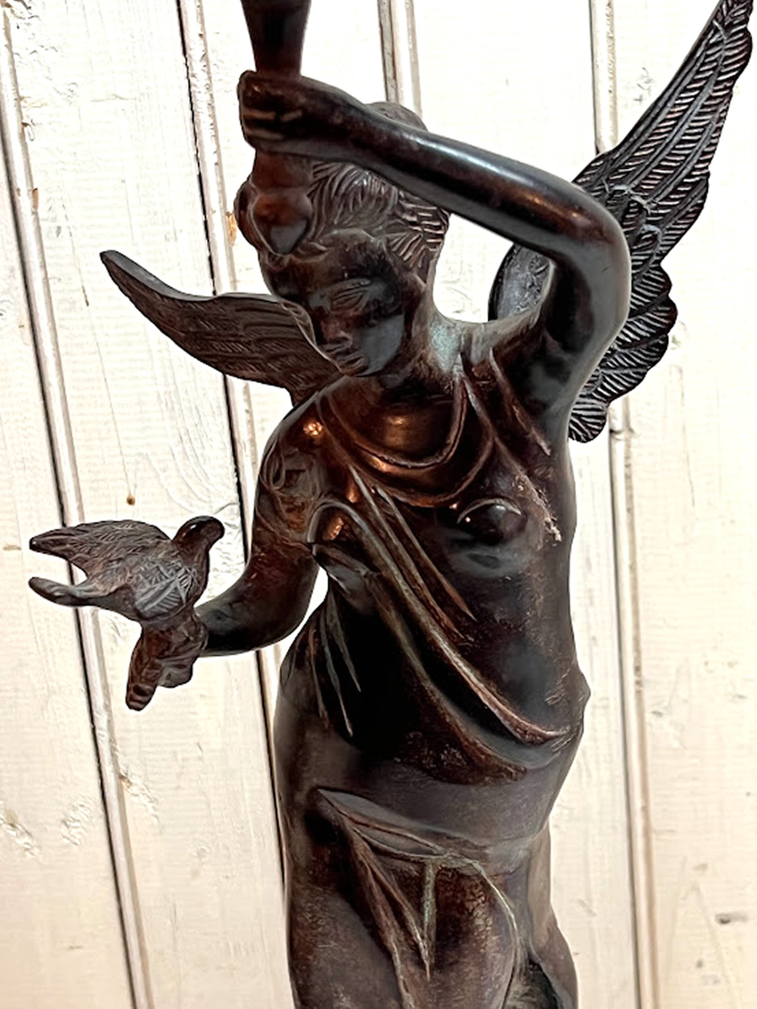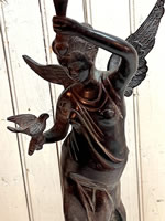 Bronze urn style sculpture of lady holding a dove, 24in. tall, illegible signature |
