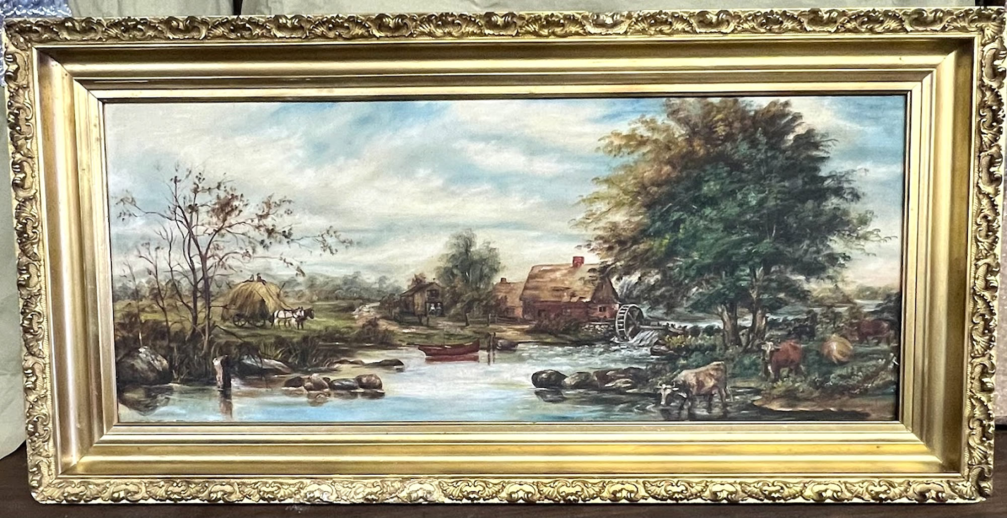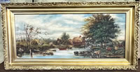 . Country landscape oil with hay wagon,grist mill,etc. circa 1890, 12x29in. |