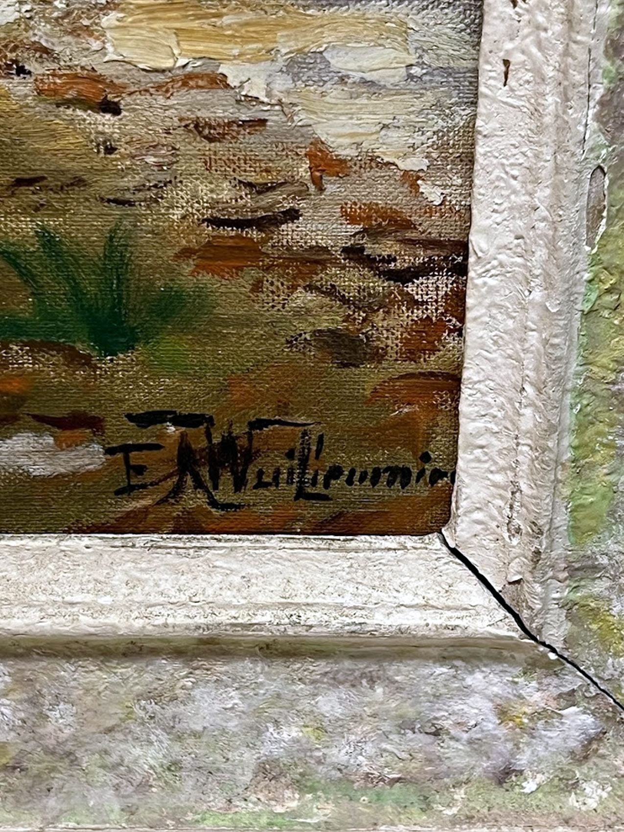 Landscape oil, illegible signature in original gold frame, 16x20in. overall