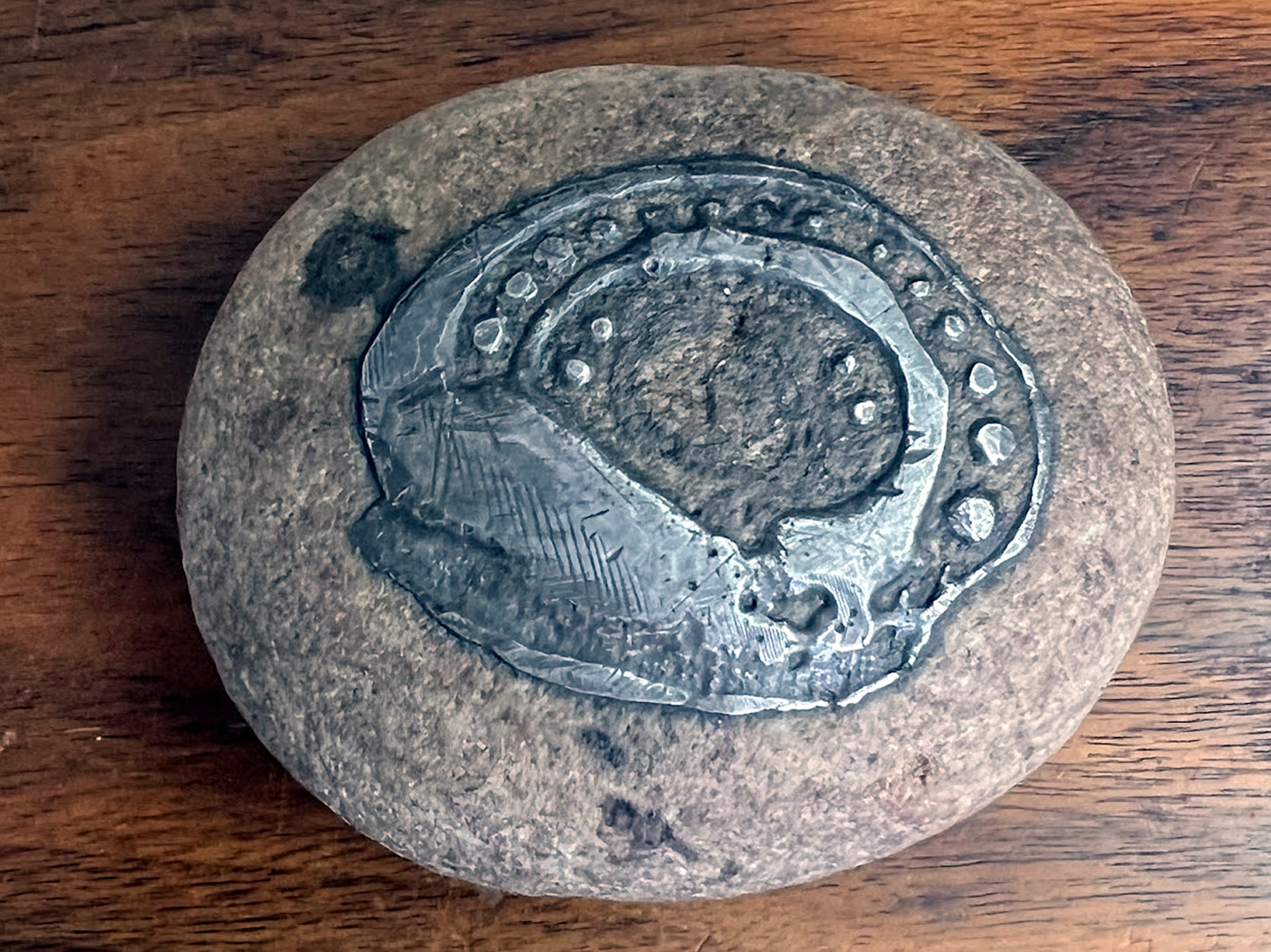 Inlaid silver in rock, 3in. by Borje Skohg, 1923-2006, Gustavsberg, Sweden
