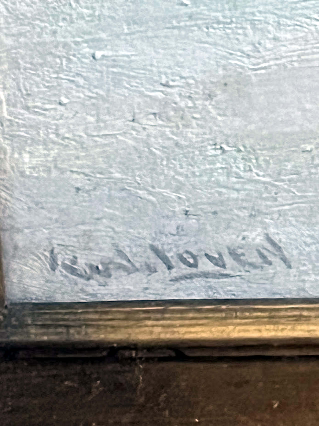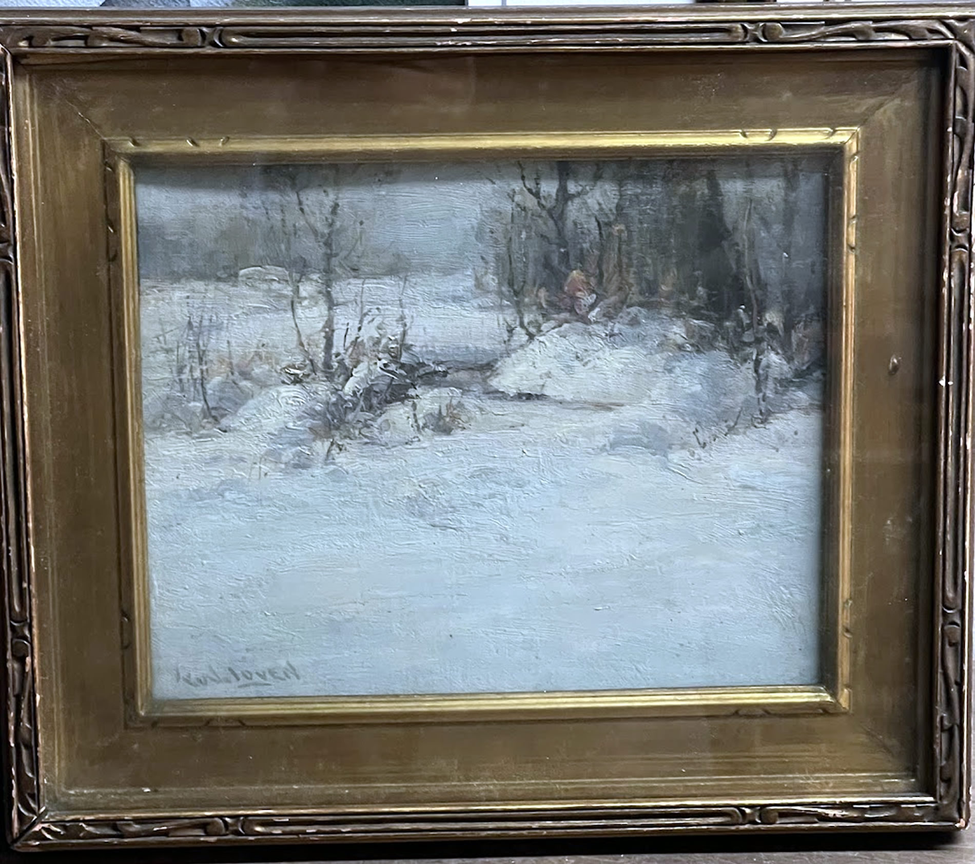 Winter scene oil by Frank w. Loven, 1861-1941, orig. museum frame, 8x10in. image |