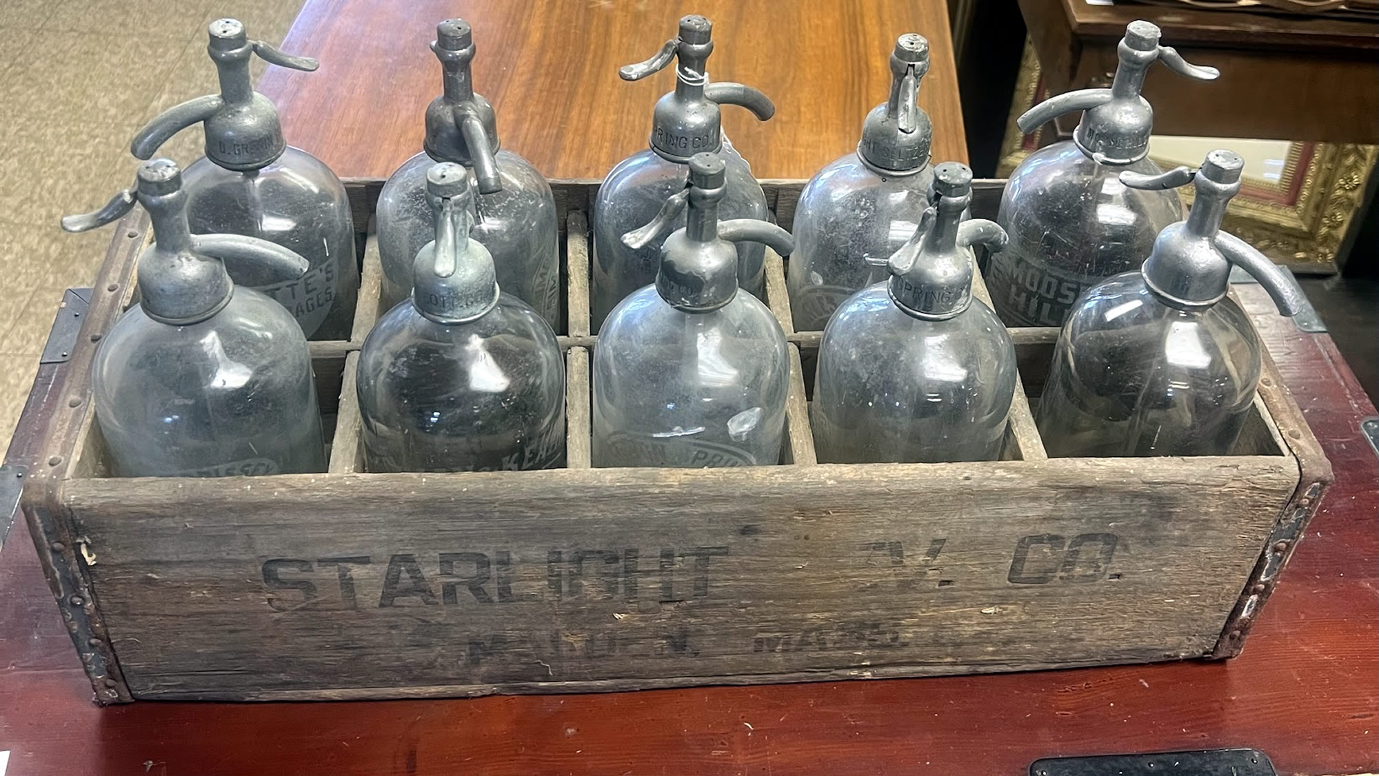 Case of old drug store seltzer bottles