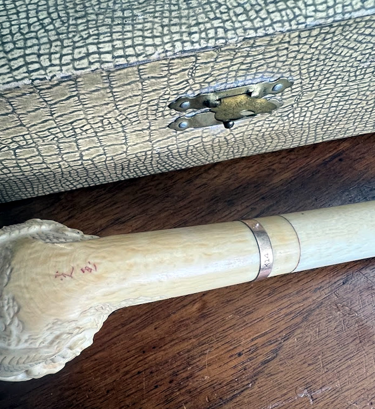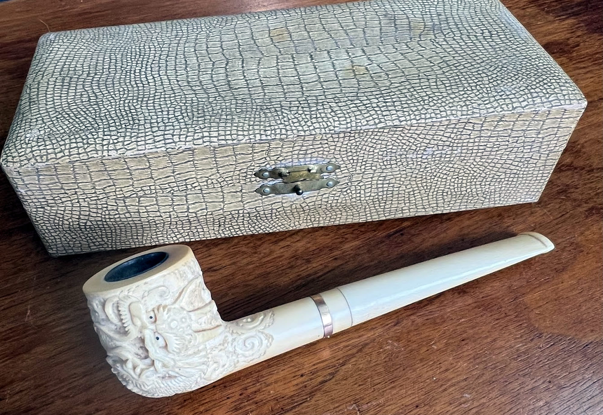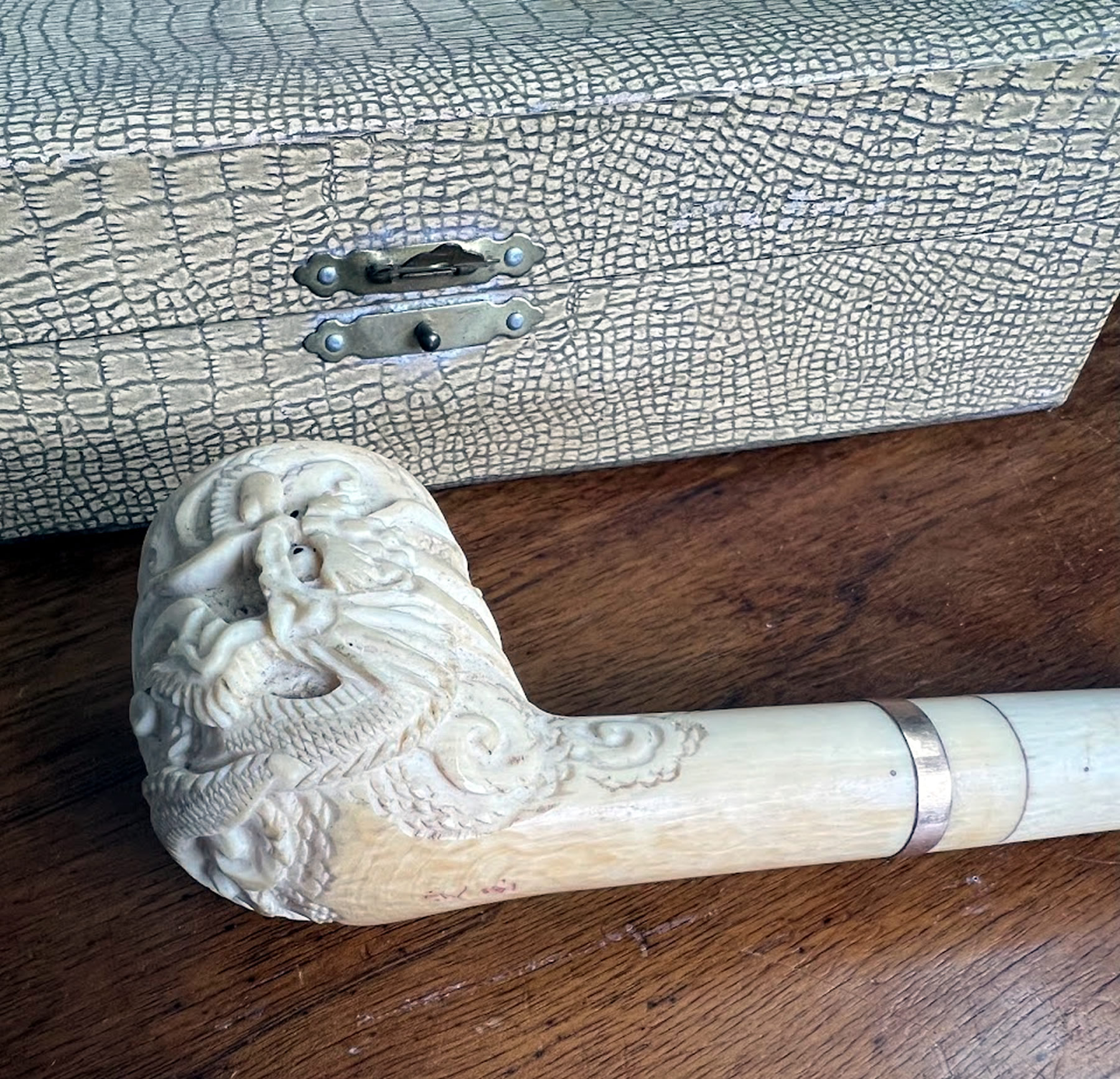 Fine Japanese carved ivory pipe in original box
