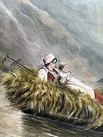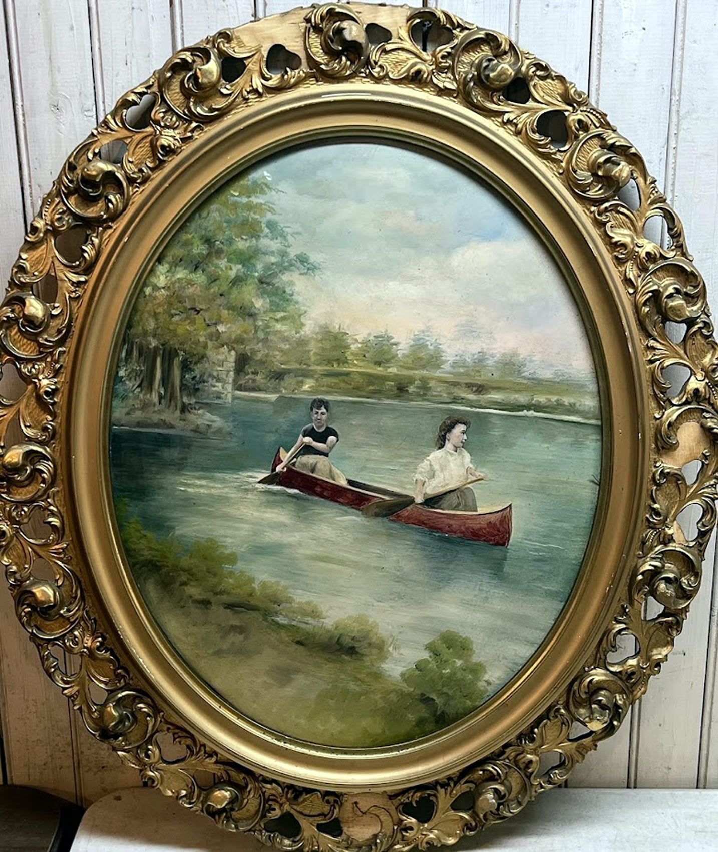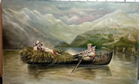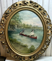 19th c. folk art oil, canoe scene, 23x37in. |