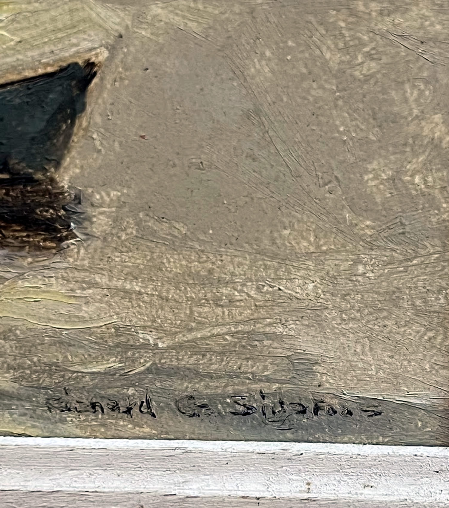 Folk art oil in original frame, 16x20in. Boston artist board label |