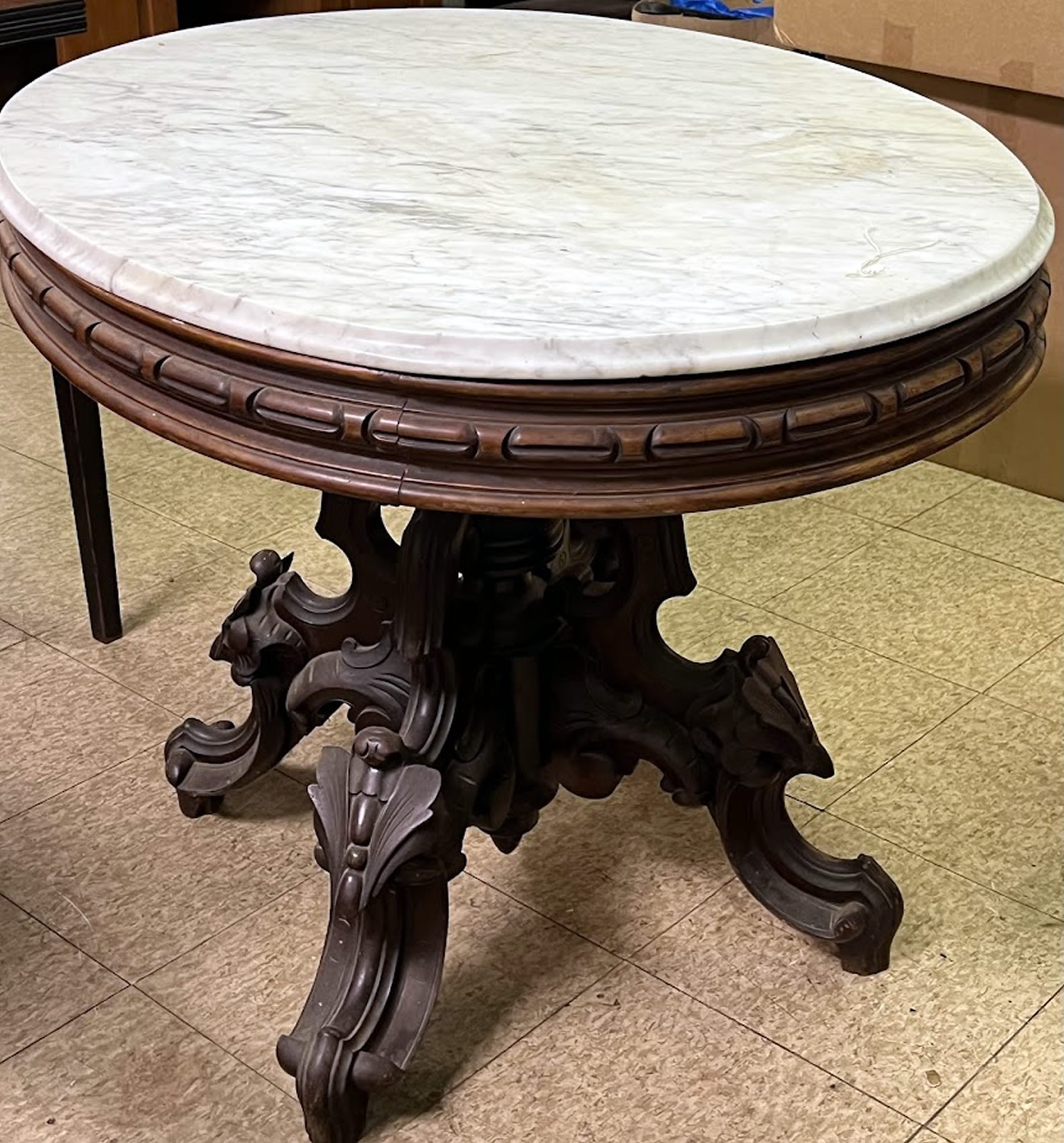Great heavy carved 19th c. marble top table, 36in top