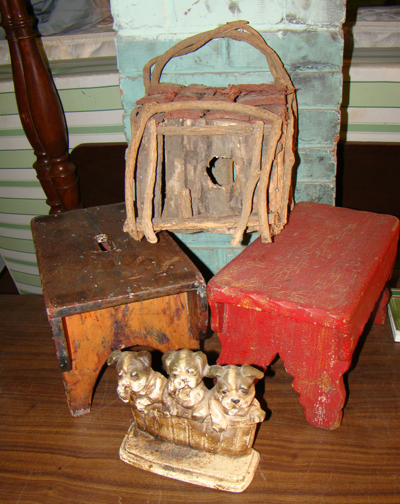bucket; child’s yellow wagon; 18 th C. brass bed warmer;