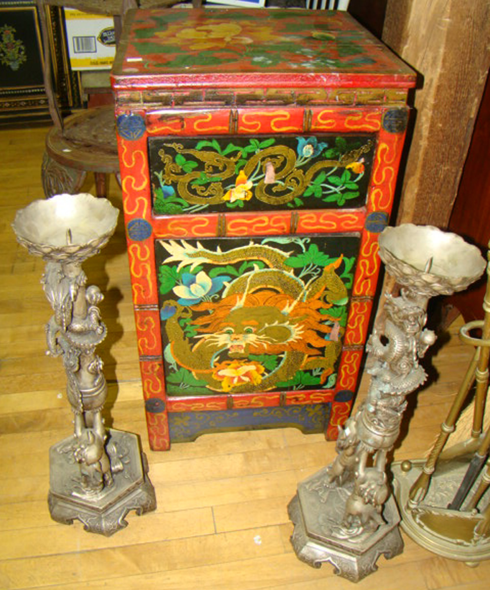 Fabulous early turquoise, amber, coral, etc. ceremonial hat in mint condition; pair of finely carved wood figures, 4-feet tall with original paint; head & hand set of armor; paint-decorated low chest with cabinet and drawers; tall metal fancy candlesticks with elephants, etc.; mixed metal 1,000 prayer bell; watercolor painting signed Fang Chao-Ling, titled "First Snow", 16" x 41"; pottery and metal decorative items sold in lots, etc.