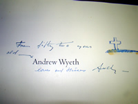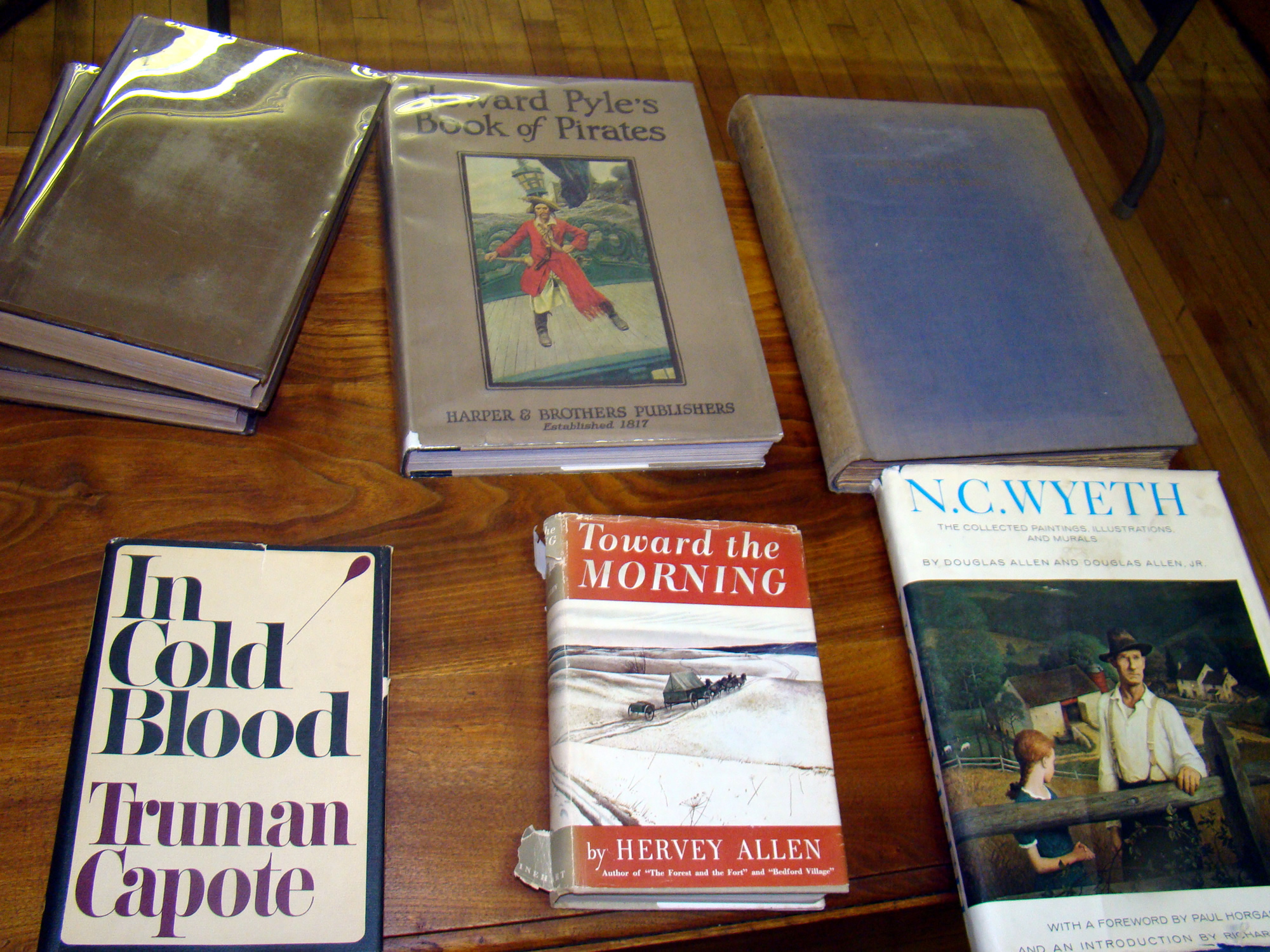 We have a wonderful selection of books from the family library. A copy of”Toward the Morning” with a full ink drawing of Salathiel driving the ark by Andrew Wyeth. The book was given to John McCoy’s father in 1948; a personalized signed Andrew Wyeth table book to his sister Ann with a drawing of a cross, Andy was 52 years old; also Wendell Haddock’s signed copy of dry brush and pencil drawings by Andrew Wyeth; also other signed Wyeth family books; also a good selection of old books in leather, and books on art and antiques; plus a rare 1 st edition of “In Cold Blood” by Truman Capote; wonderful Queen Victoria book by Richard A. Holmes; Howard Pyle’s book of pirates; N. C. Wyeth books; “The Stray” signed by Betsy & Jamie Wyeth; early copy of John Steinbeck's "The Moon Is Down".