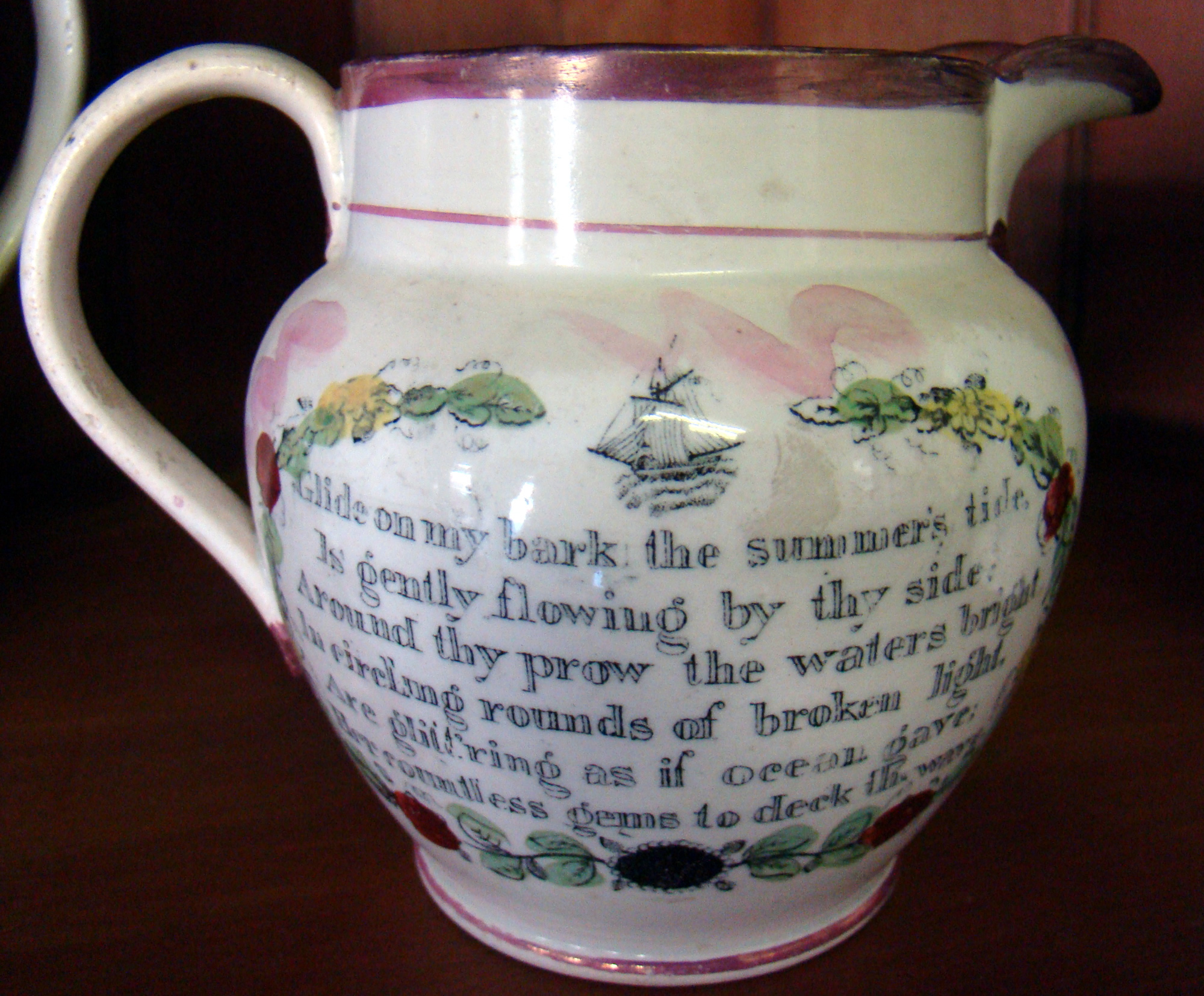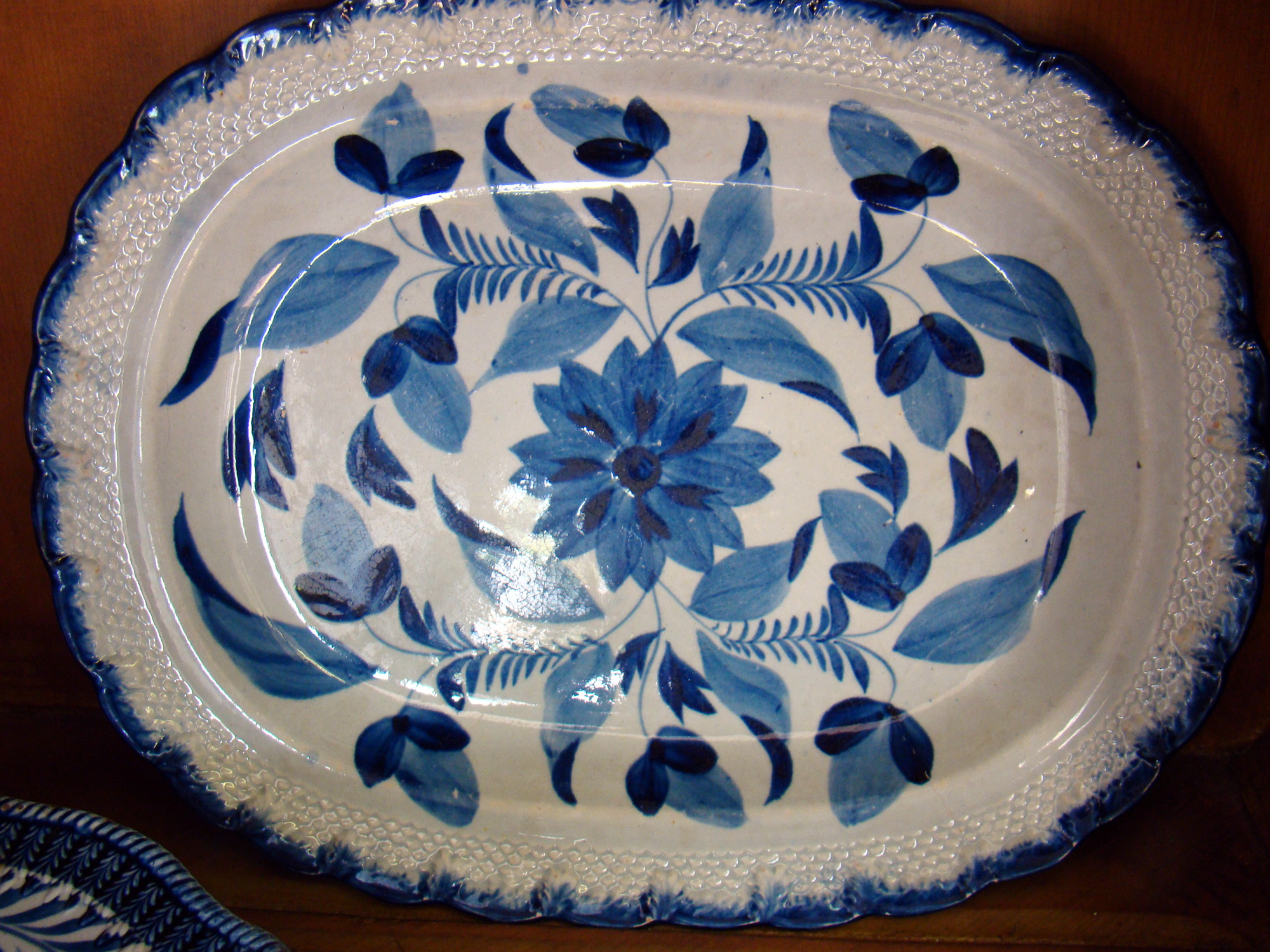 Our offering of early china is very good this year. Early Staffordshire; mocha pitchers; small Liverpool pitcher; mocha shakers and salts; large rare blue platter (mint); and much more.