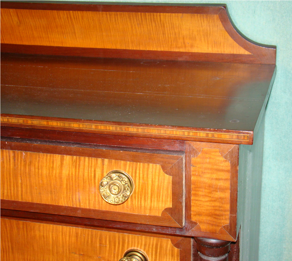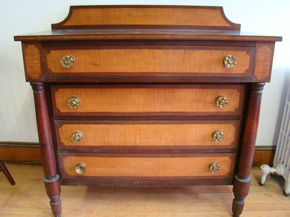 hinges and straps; transitional 4-drawer chest with tiger maple