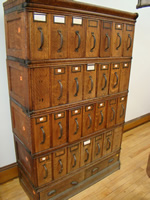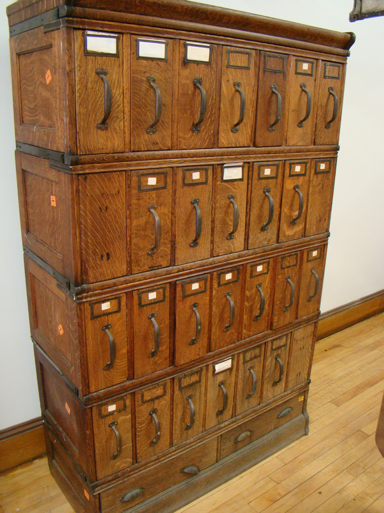 circa 1810; oak railway station 34-drawer, 4-section file; brass-bound