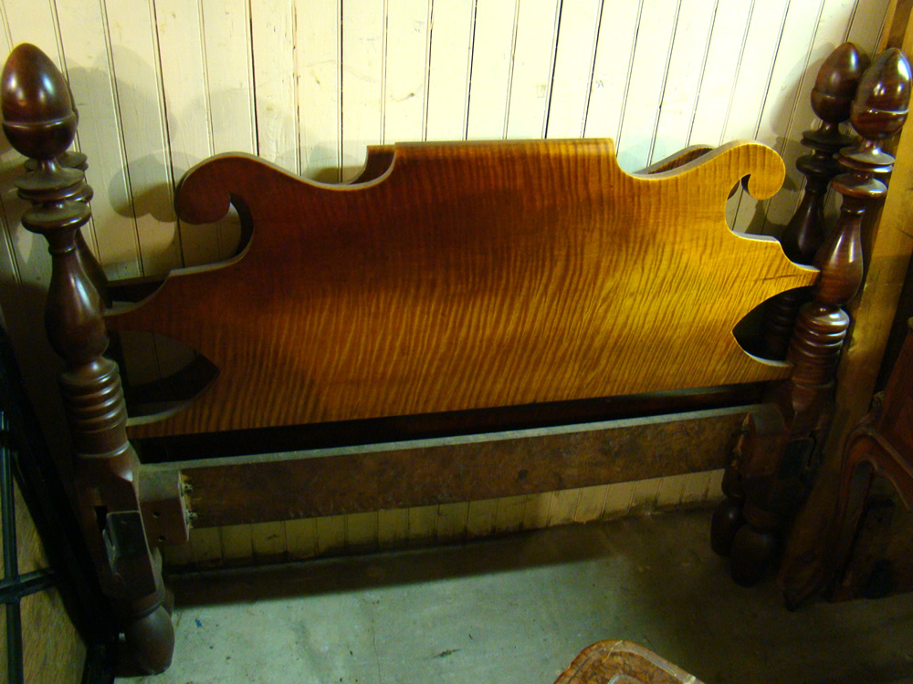 pair of Chippendale side chairs; tiger maple acorn field bed