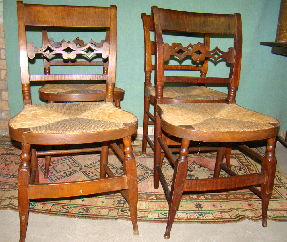 tiger maple side chairs with carved open work back slat; a 2-drawer