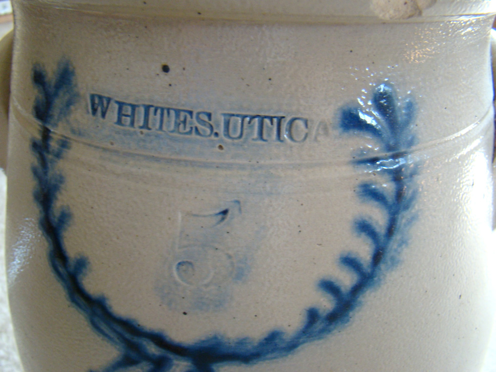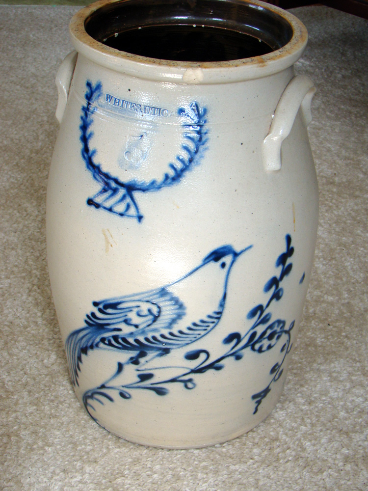 stoneware churn by Whites of Utica, NY with large blue bird on