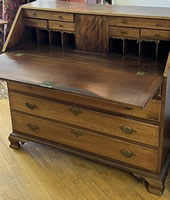 | 19th c. Slant front mahogany writing desk with ogee feet, 40in.w. |