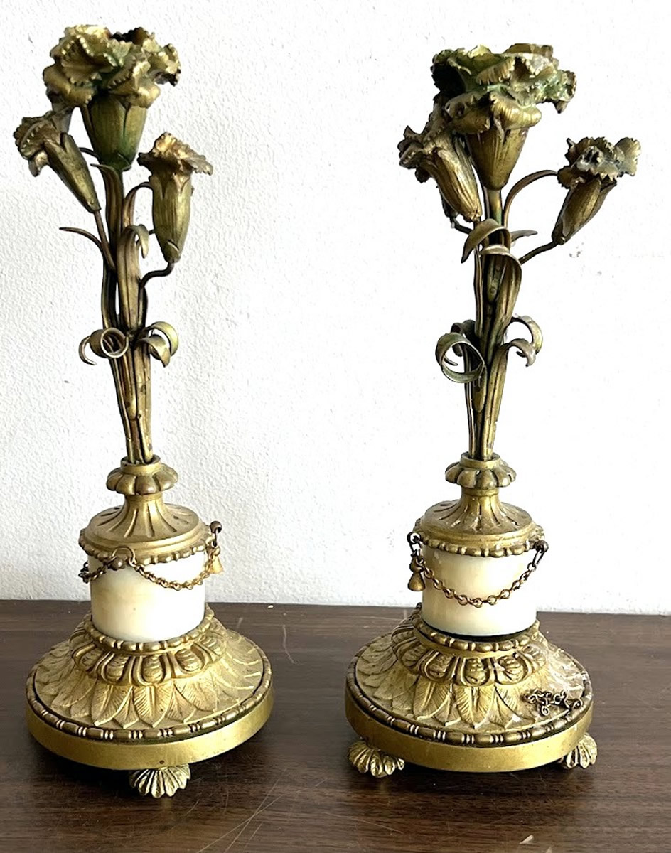 Pr. of French gilded bronze candlesticks, 10in.