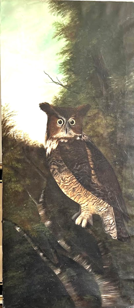 Hoot owl oil painting, unsigned, 18in.x40in. |