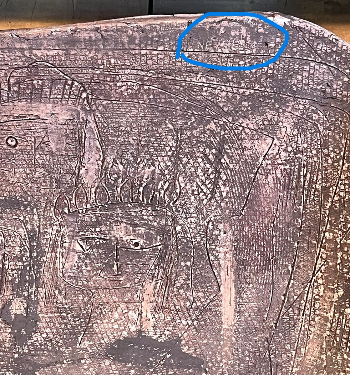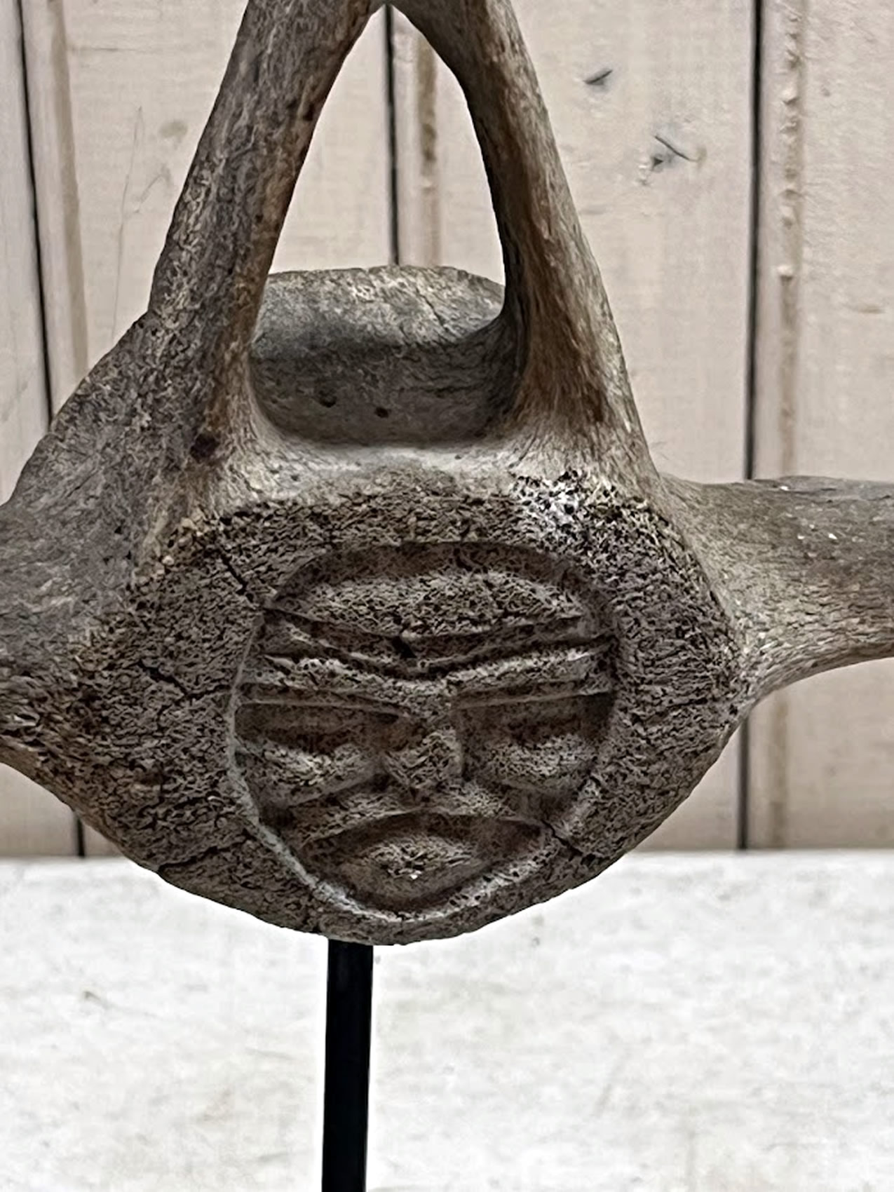 Inuit Eskimo face carved on whale vertebrae mounted on plinth, 16in.