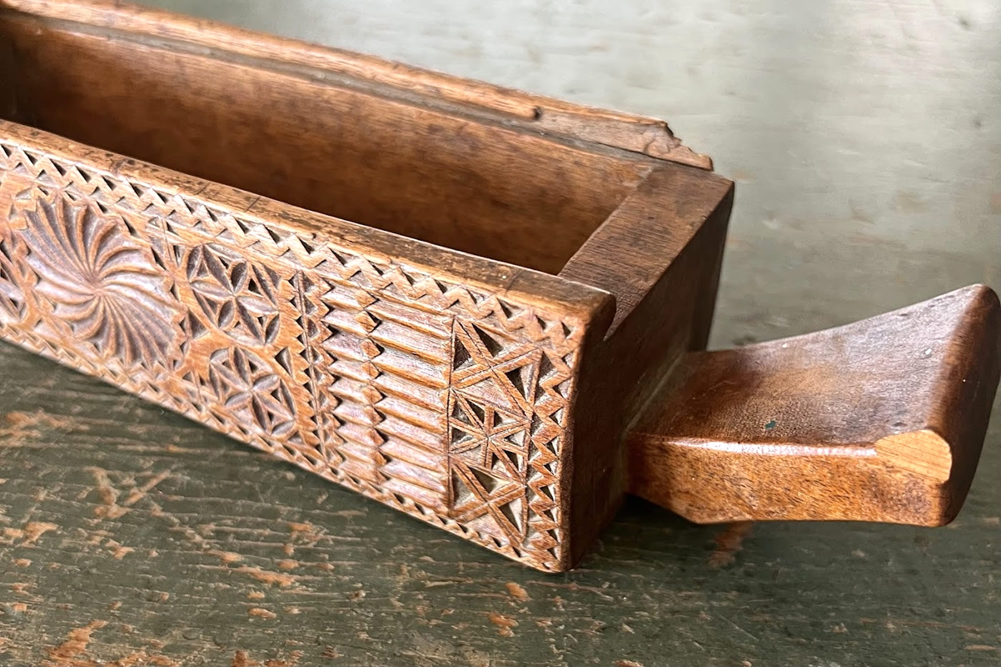 Rare pencil box chip carved on a prison ship, 7in. |