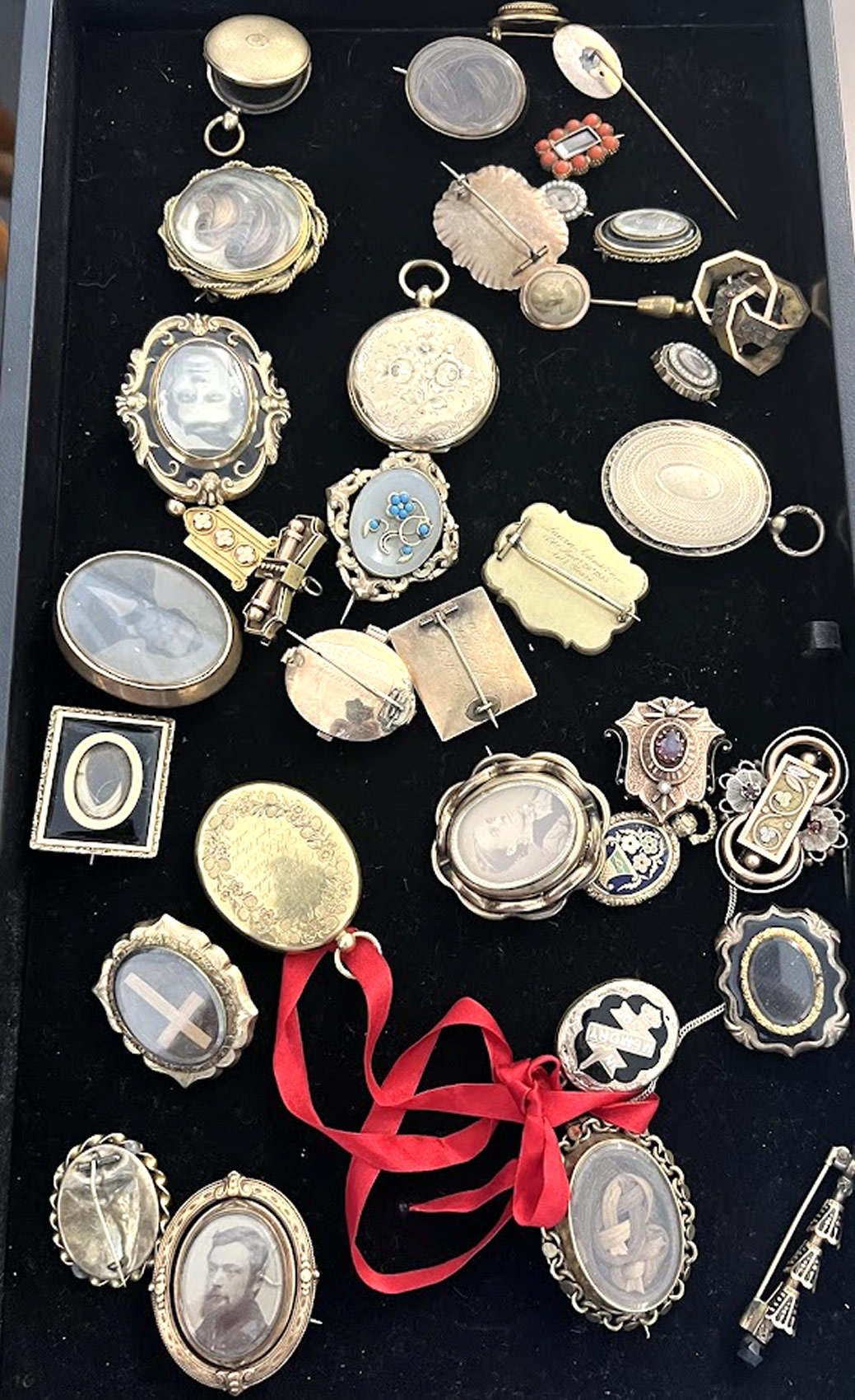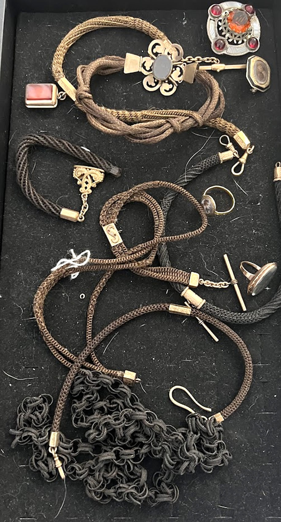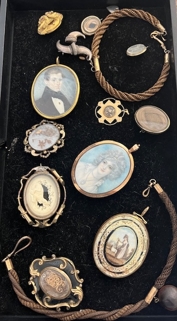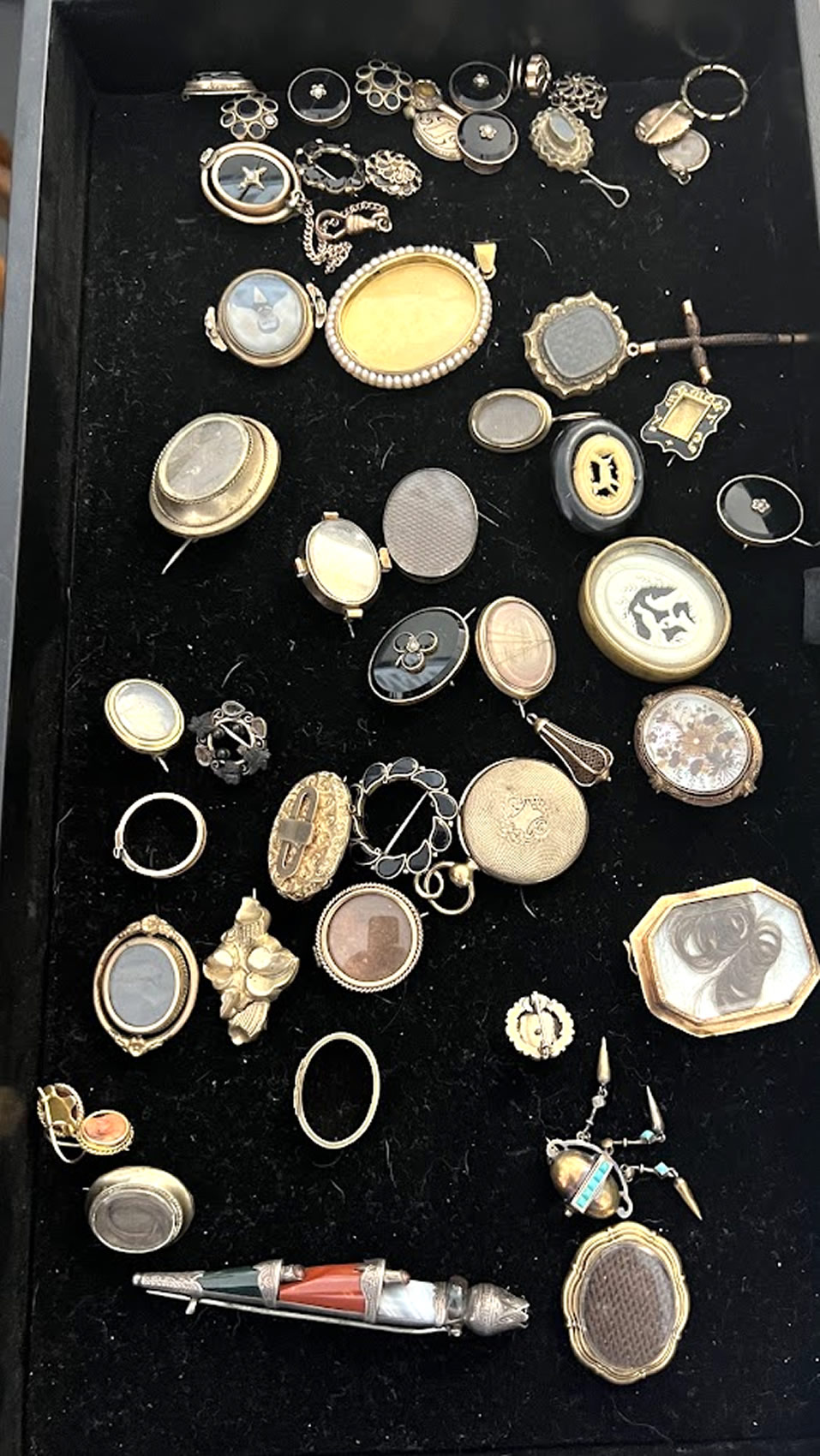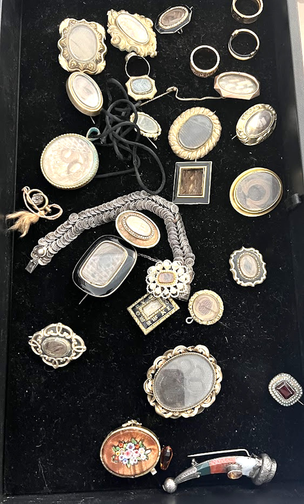 Important collection of mourning, remembrance, and hair jewelry, over 100 pcs. in 5 trays
