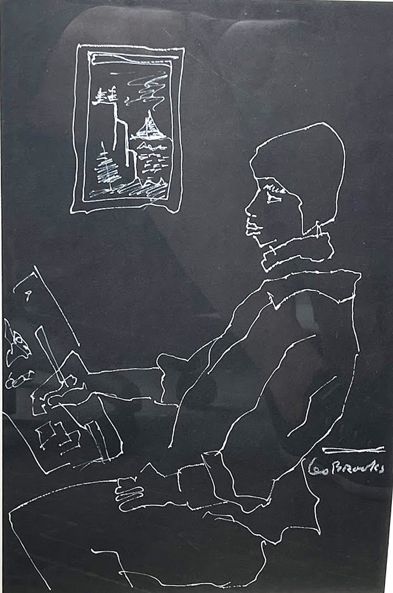 Original white ink drawing on black paper by Leo Brooks, 1909-1993, 13x 19in. |