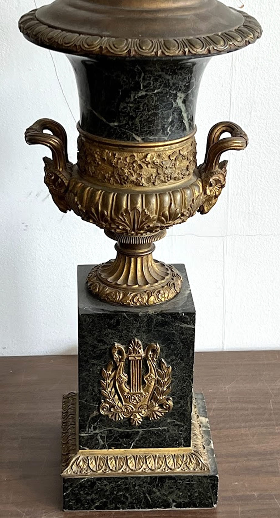 | Pair of French green marble base urns with ormolu mounts, urns are 17in. tall |