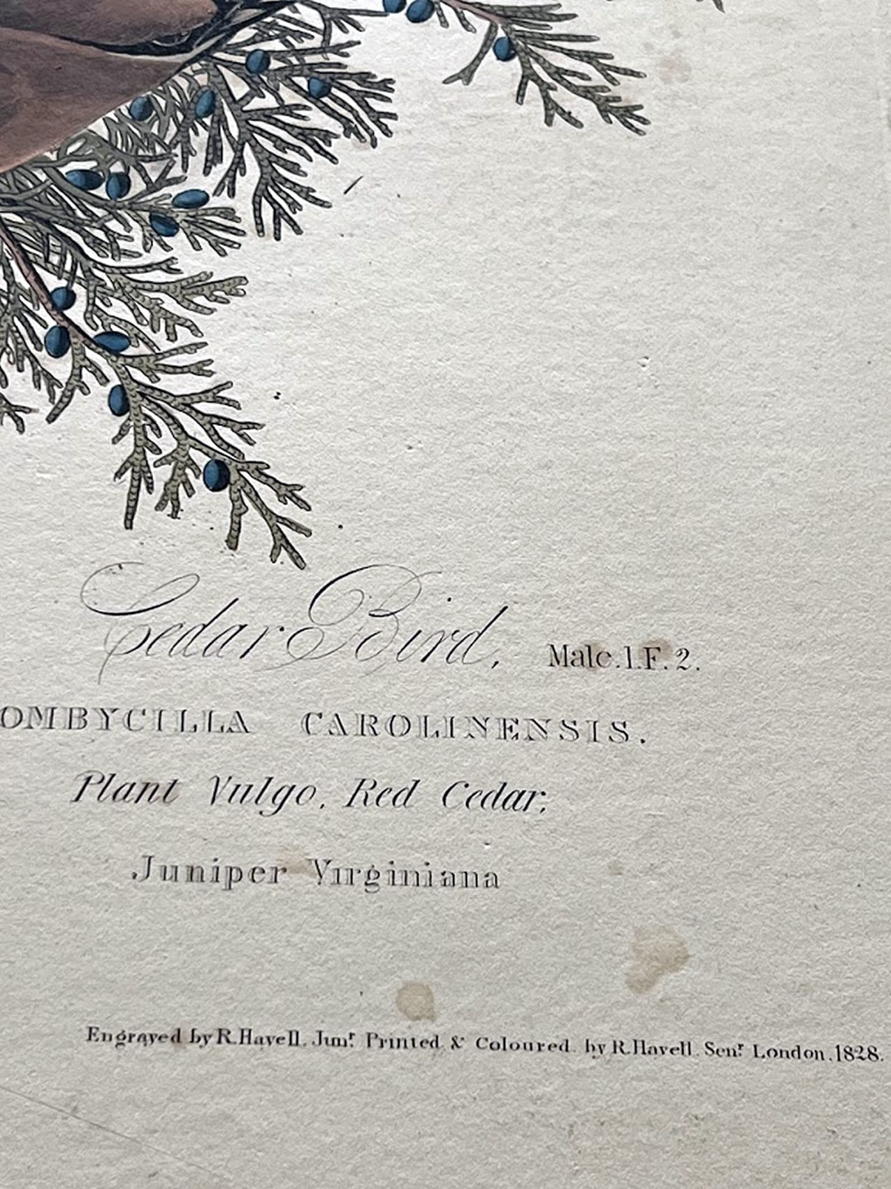 After J. J. Audubon by Robert Havell, titled (Cedar Bird) Plate 43, hand colored, 1828, 12,75x 19.5in. |