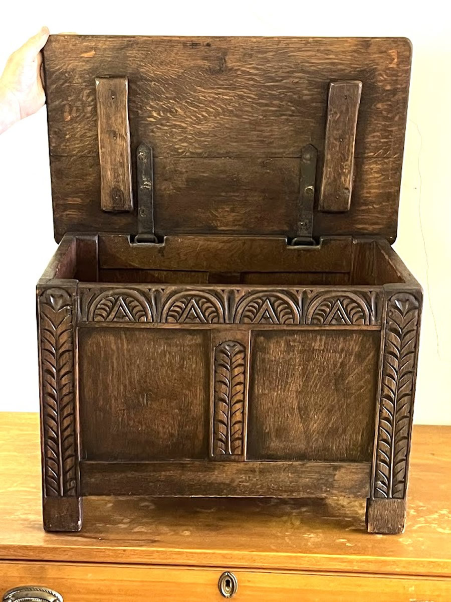 | Early diminutive oak dower chest with carved front, oak, 22in.w. x 16.5in h. circa 1820 |