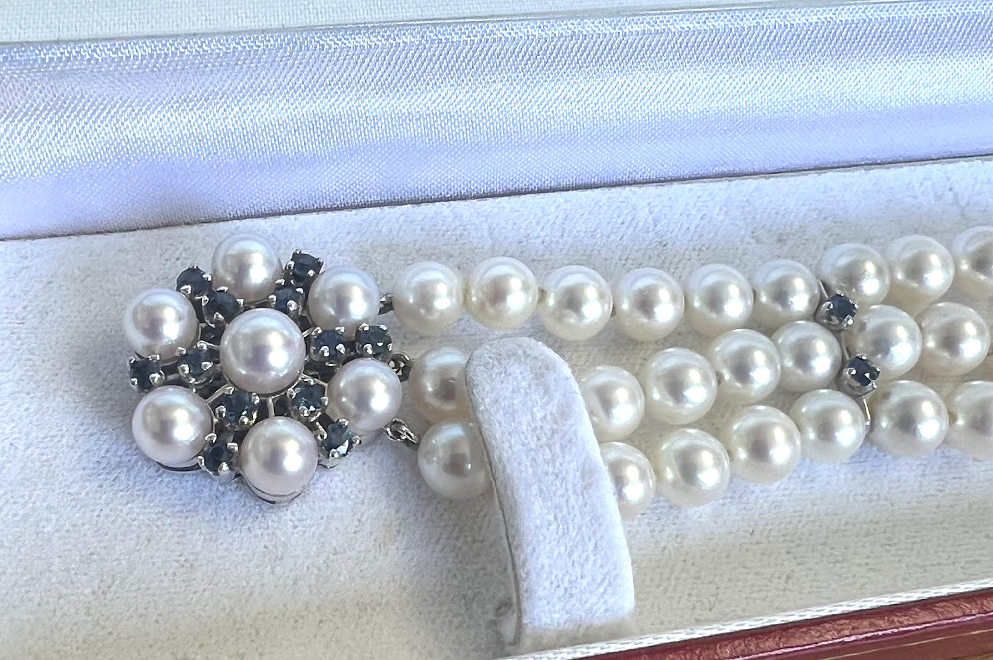 Elegant pearl bracelet with sapphire clasp, 14k |