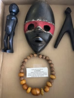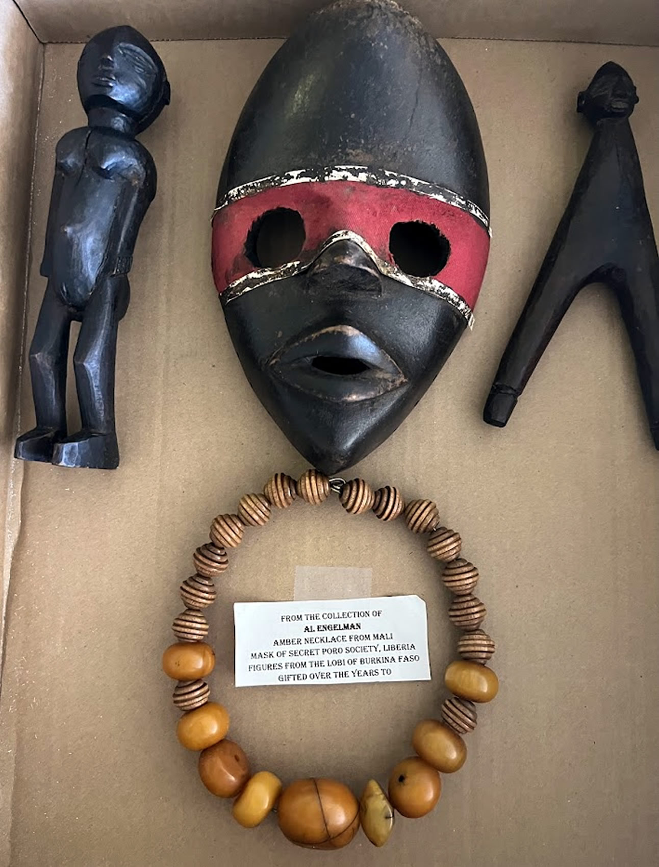 Amber necklace, mask of Secret Poro Society, 2 carved figures from the Lobi of Burkina Faso