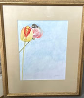 Watercolor by Morris Broderson, 1928-2011 titled ( Bird on Rose and Tulip, 1984, 13.5in.x 10.5in